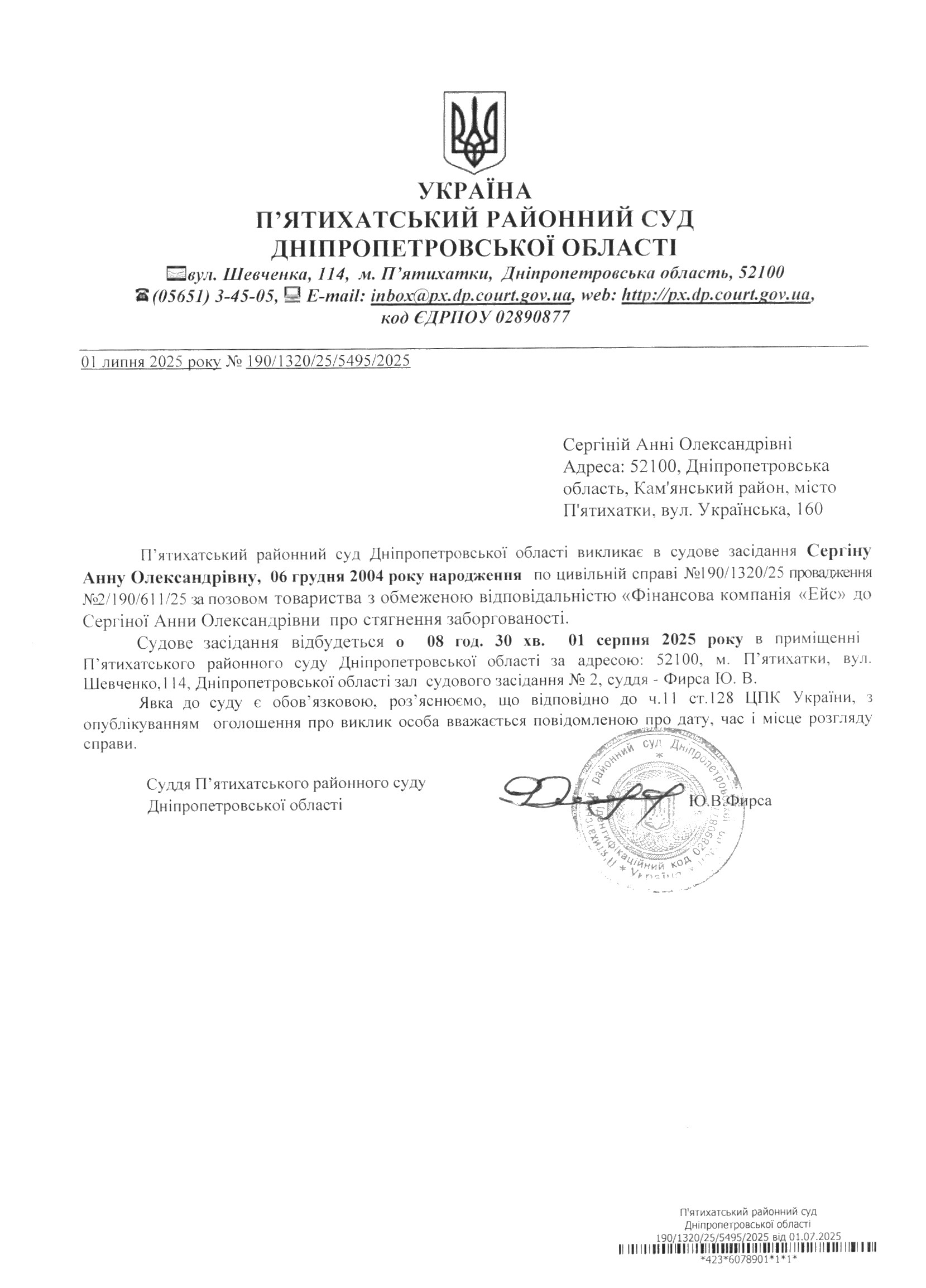 Про виклик в судове засідання Сергіна Анна Олександрівна