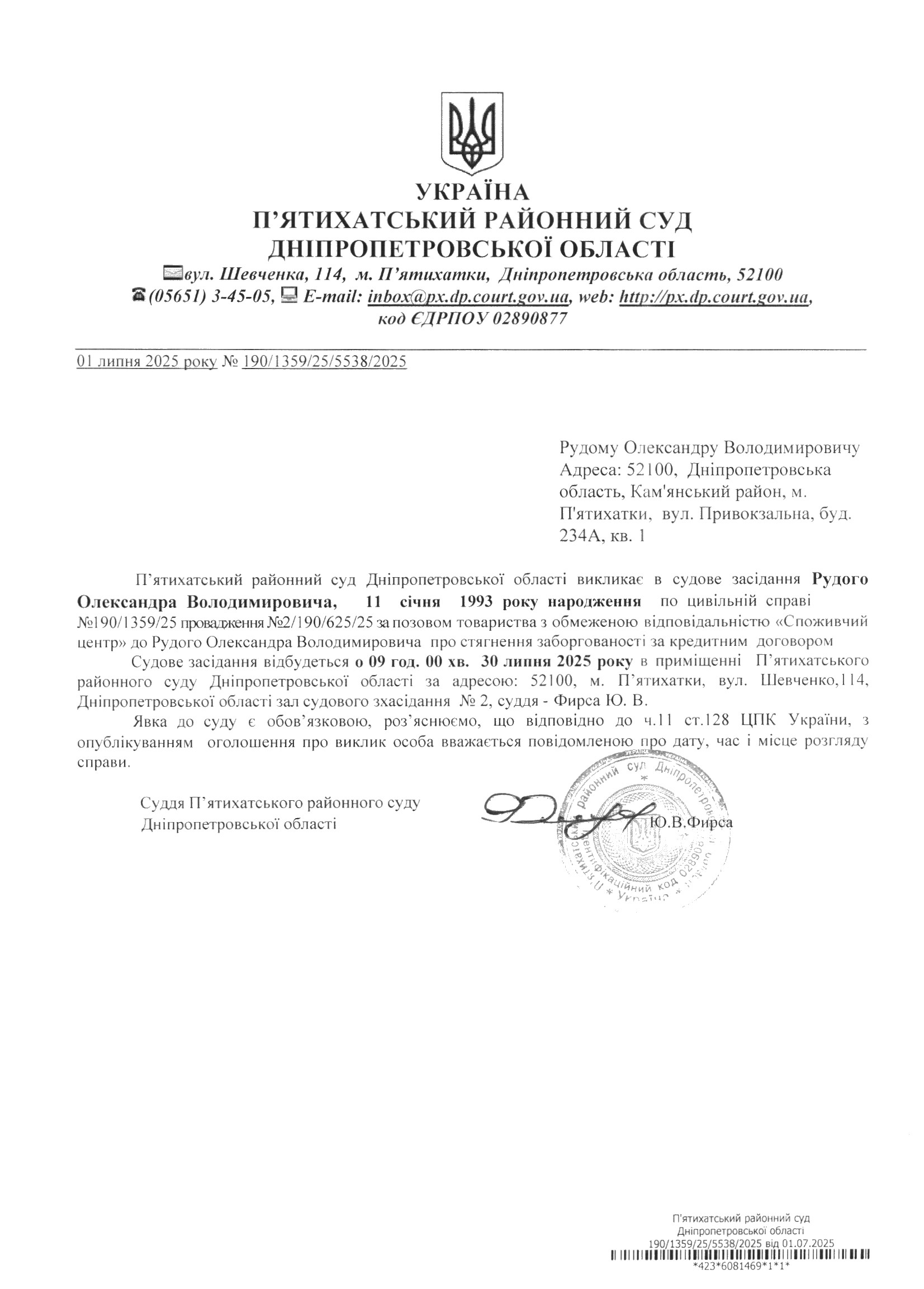 Про виклик в судове засідання Рудий Олександр Володимирович