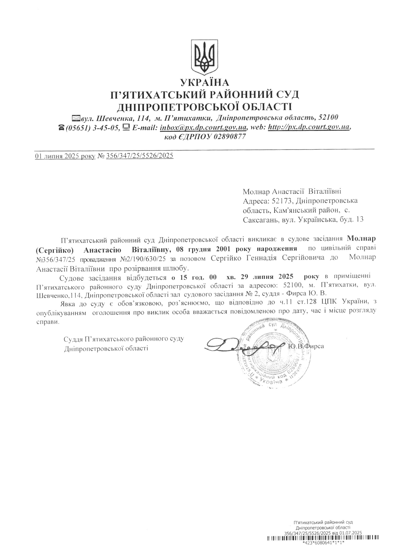 Про виклик в судове засідання Молнар Анастасія Віталіївна