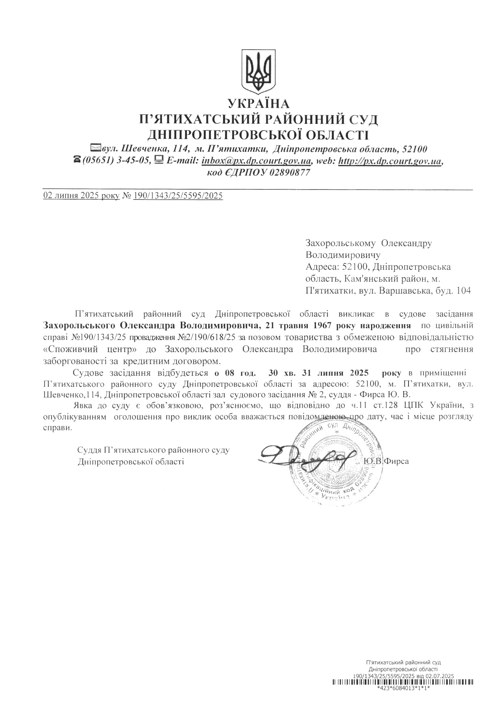 Про виклик в судове засідання Захорольський Олександр Володимирович