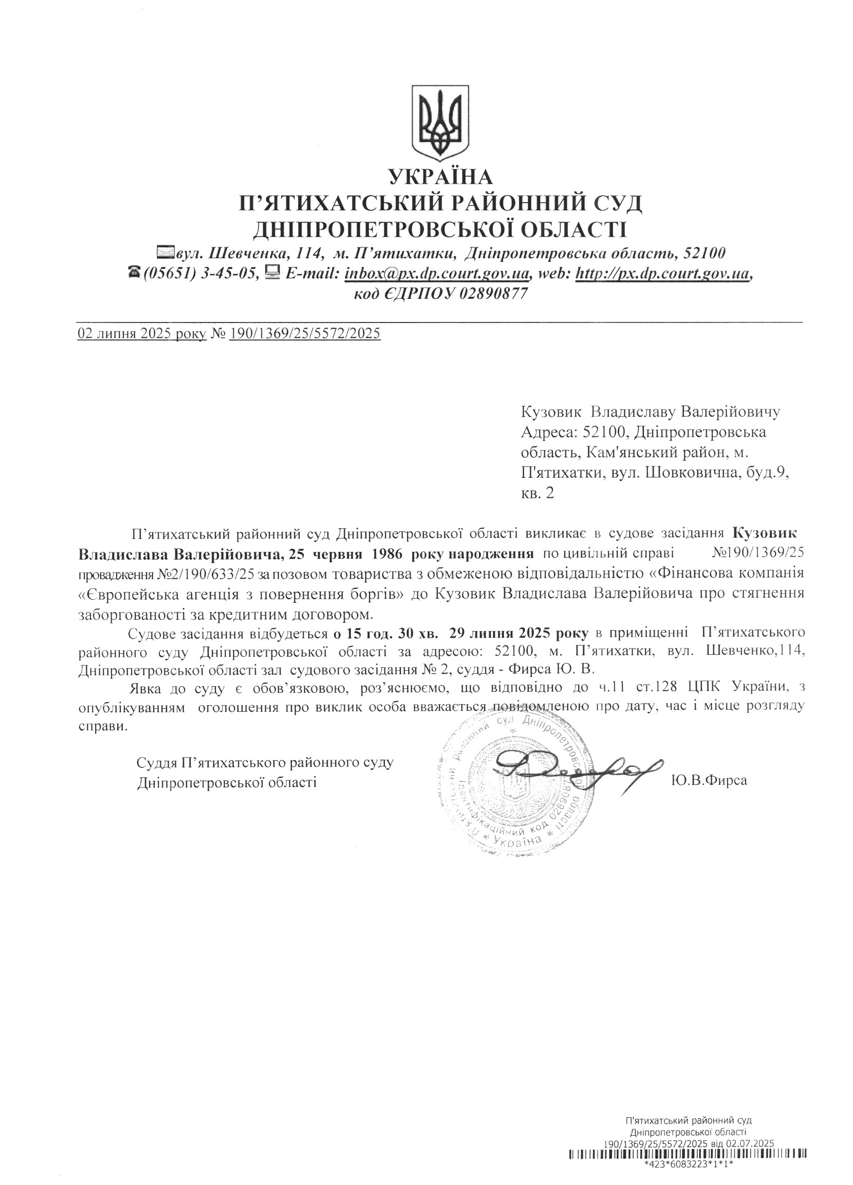 Про виклик в судове засідання Кузовик Владислав Валерійович