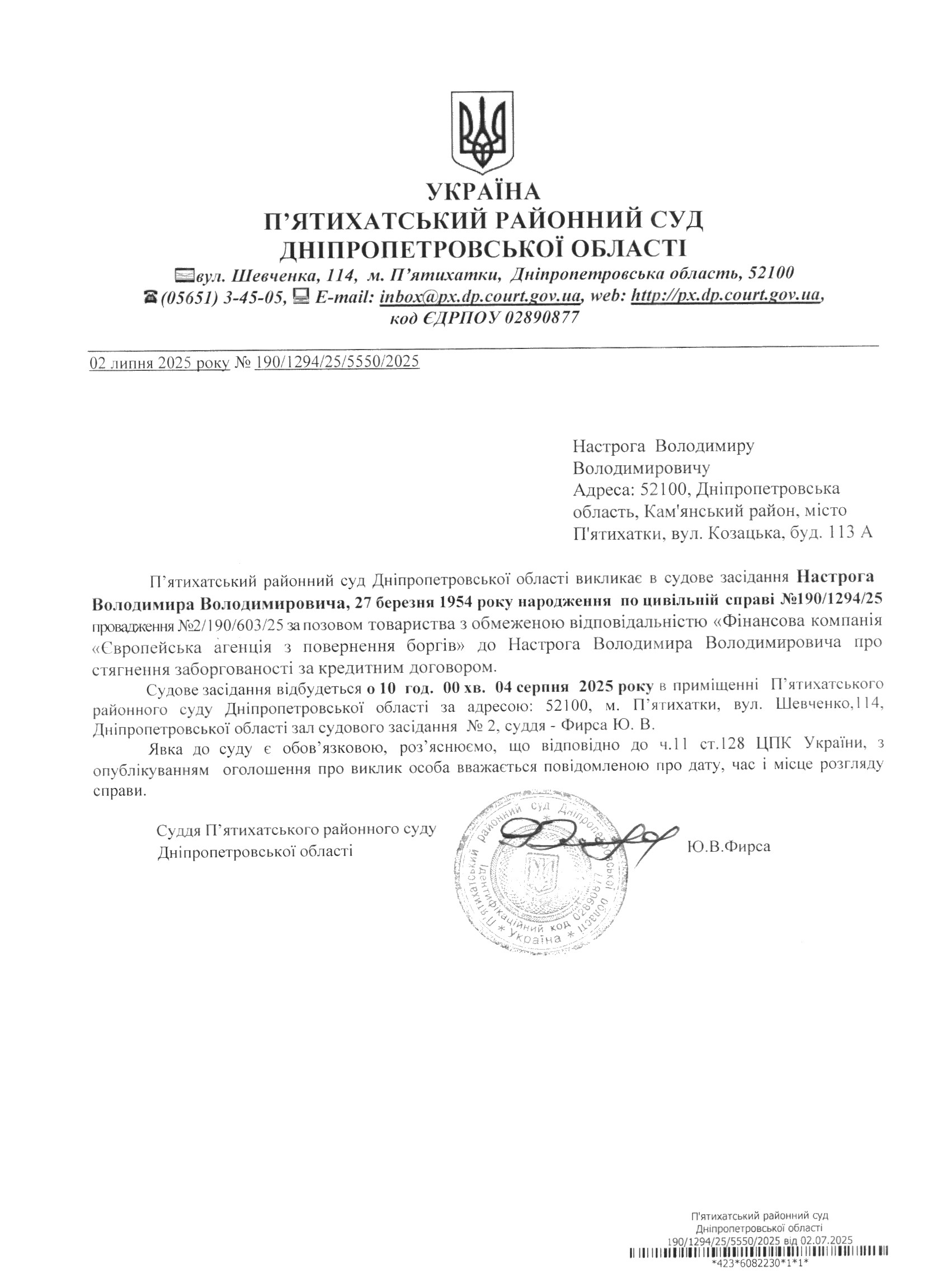Про виклик в судове засідання Настрога Володимир Володимирович