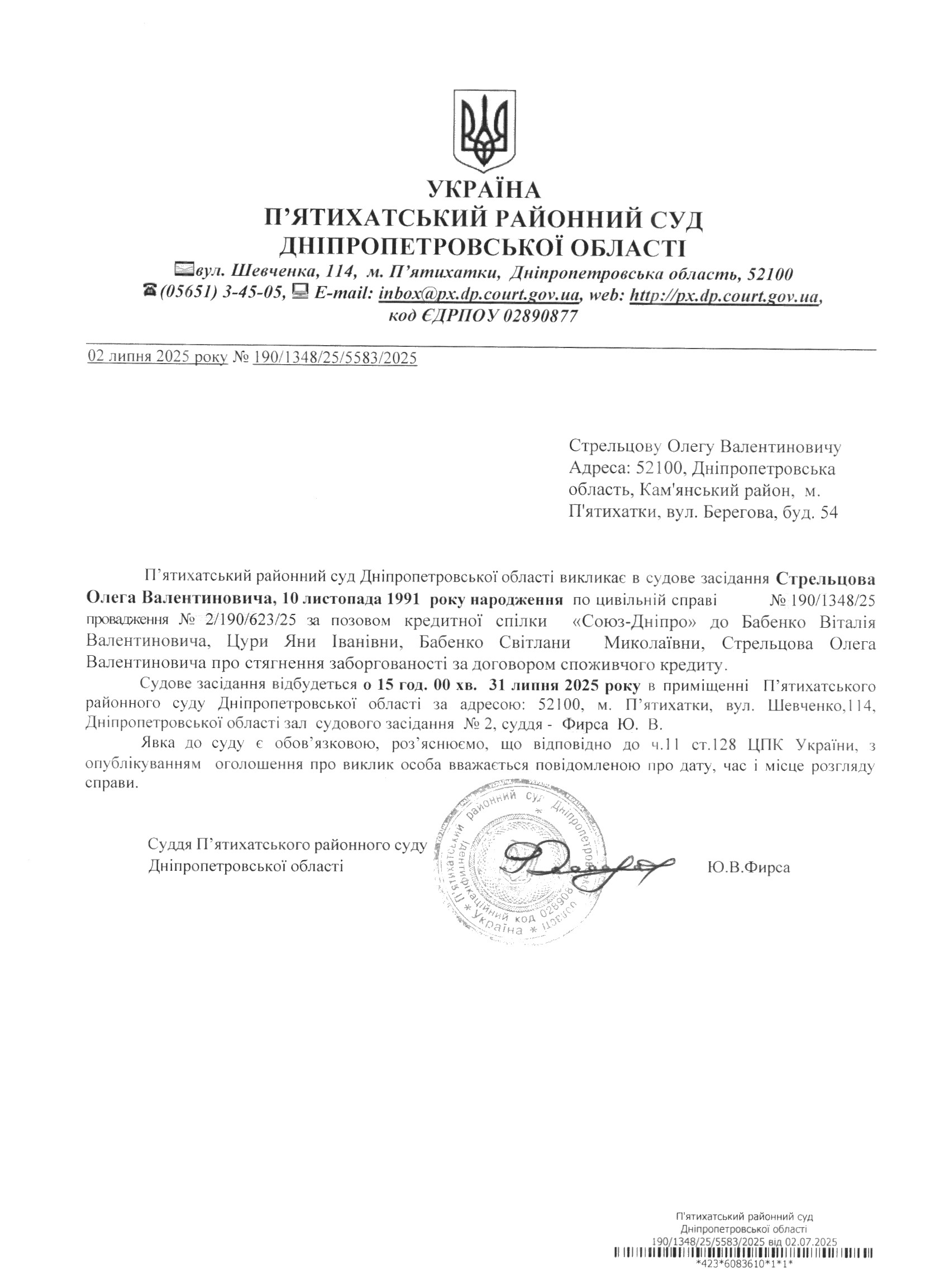 Про виклик в судове засідання Стрельцов Олег Валентинович