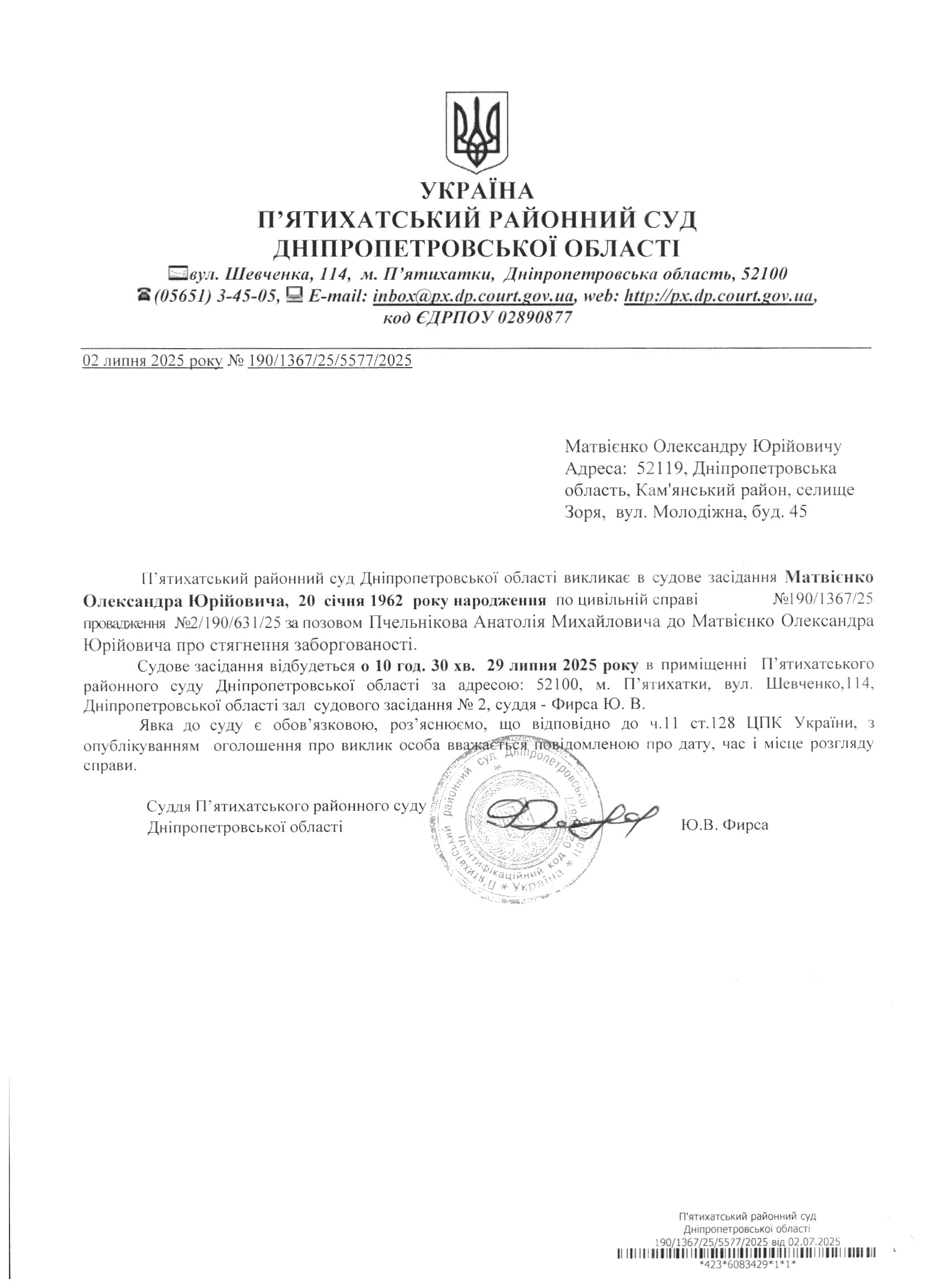 Про виклик в судове засідання Матвієнко Олександр Юрійович