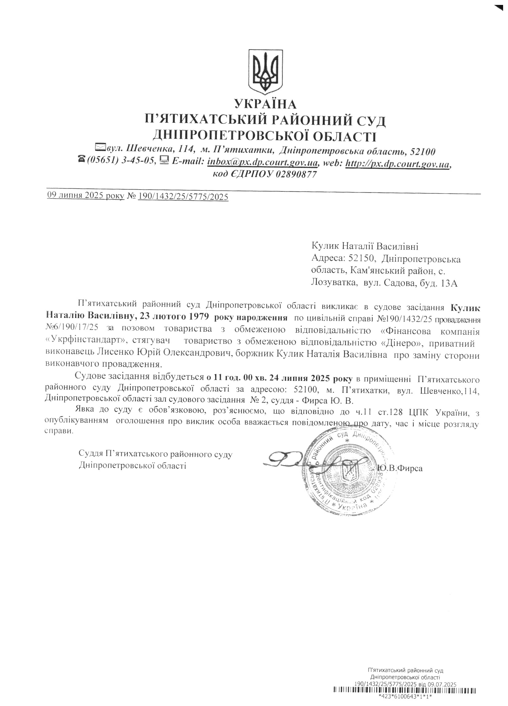 Про виклик в судове засідання Кулик Наталії Вікторівни