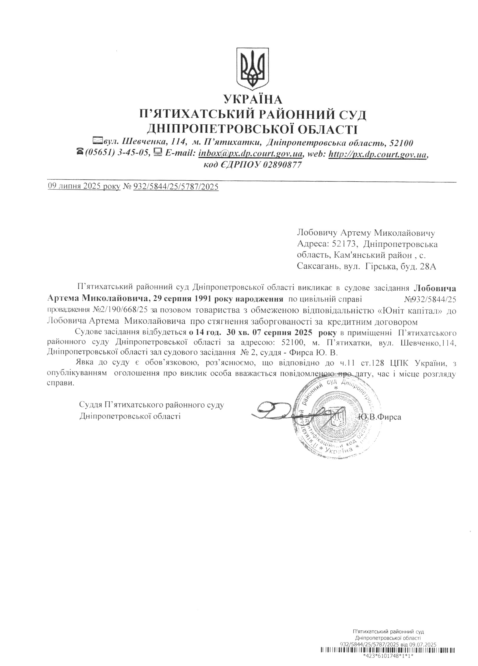 Про виклик в судове засідання Лобовича Артема Миколайовича
