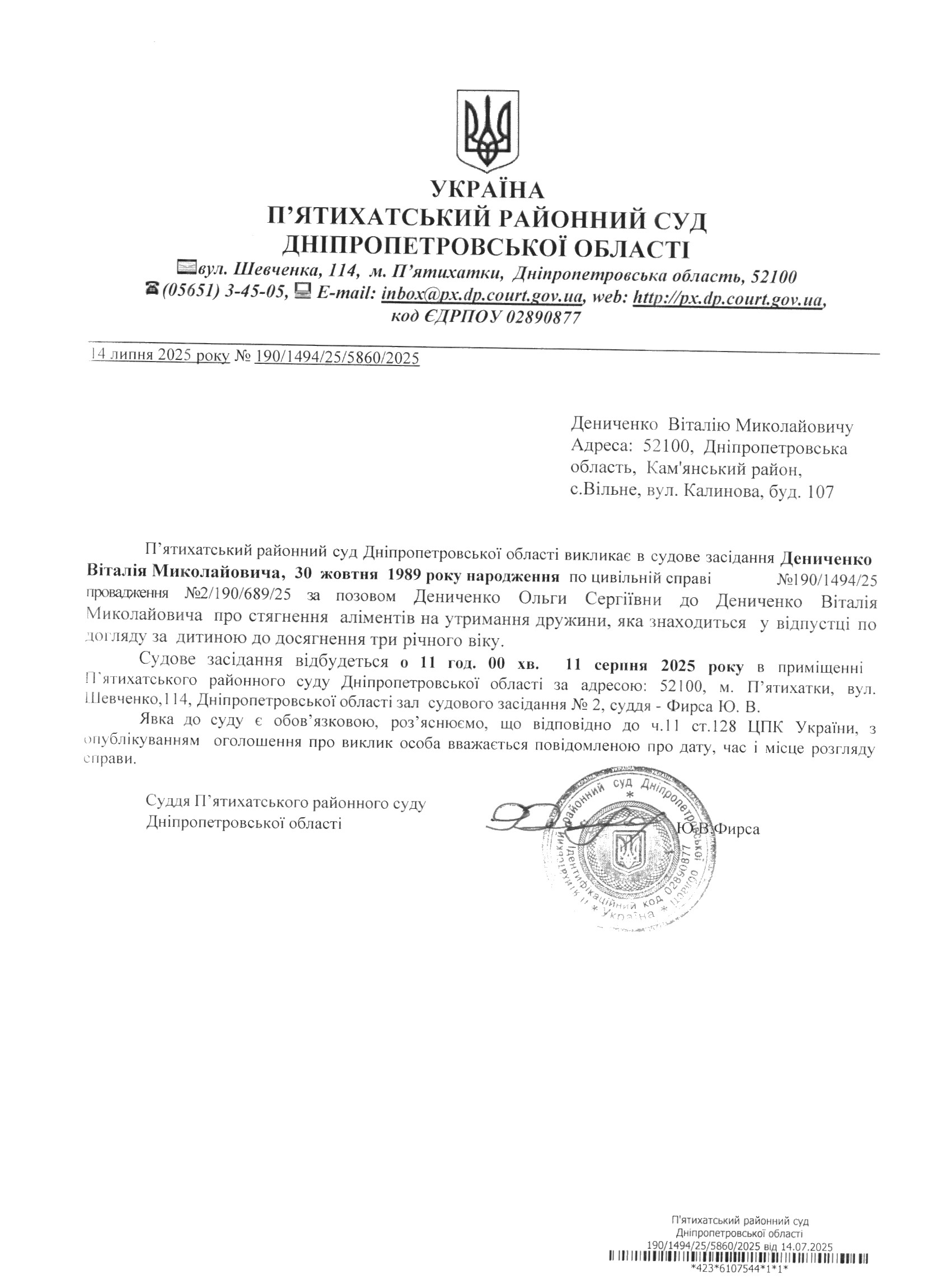 Про виклик в судове засідання Дениченка Віталія Миколайовича