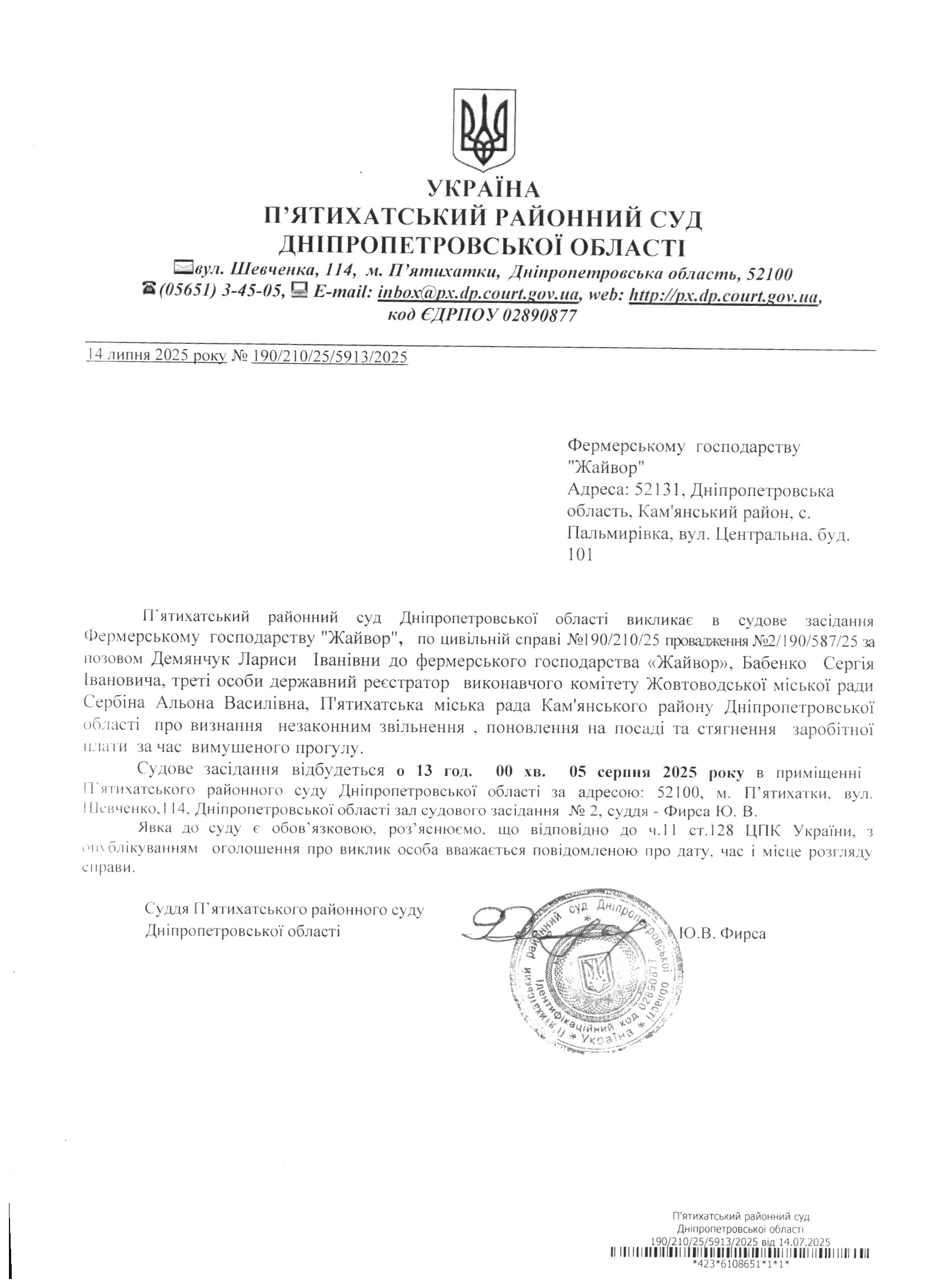 Про виклик в судове засідання Фермерське господарство "Жайвор"