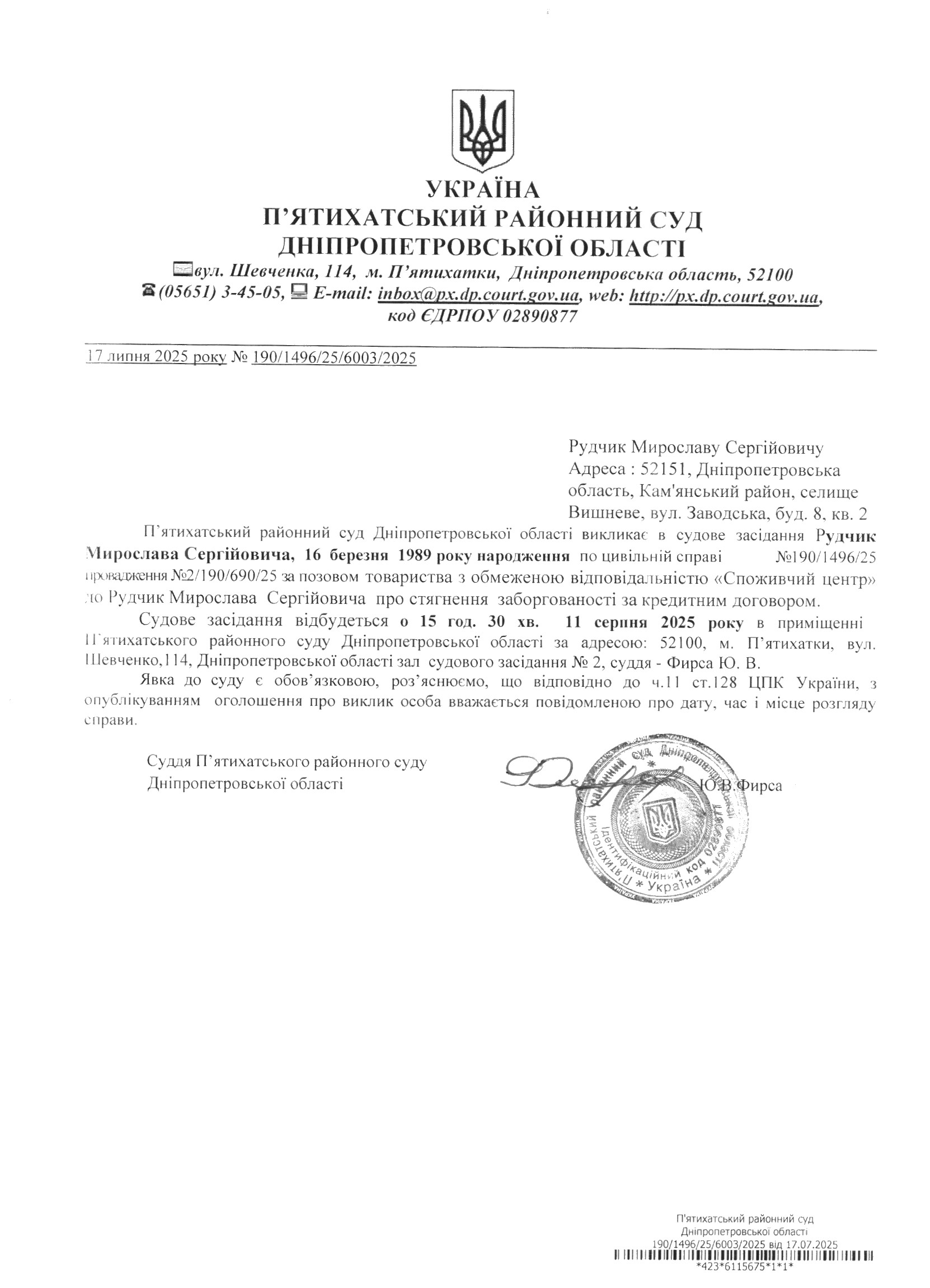 Про виклик в судове засідання Рудчик Мирослава Сергійовича
