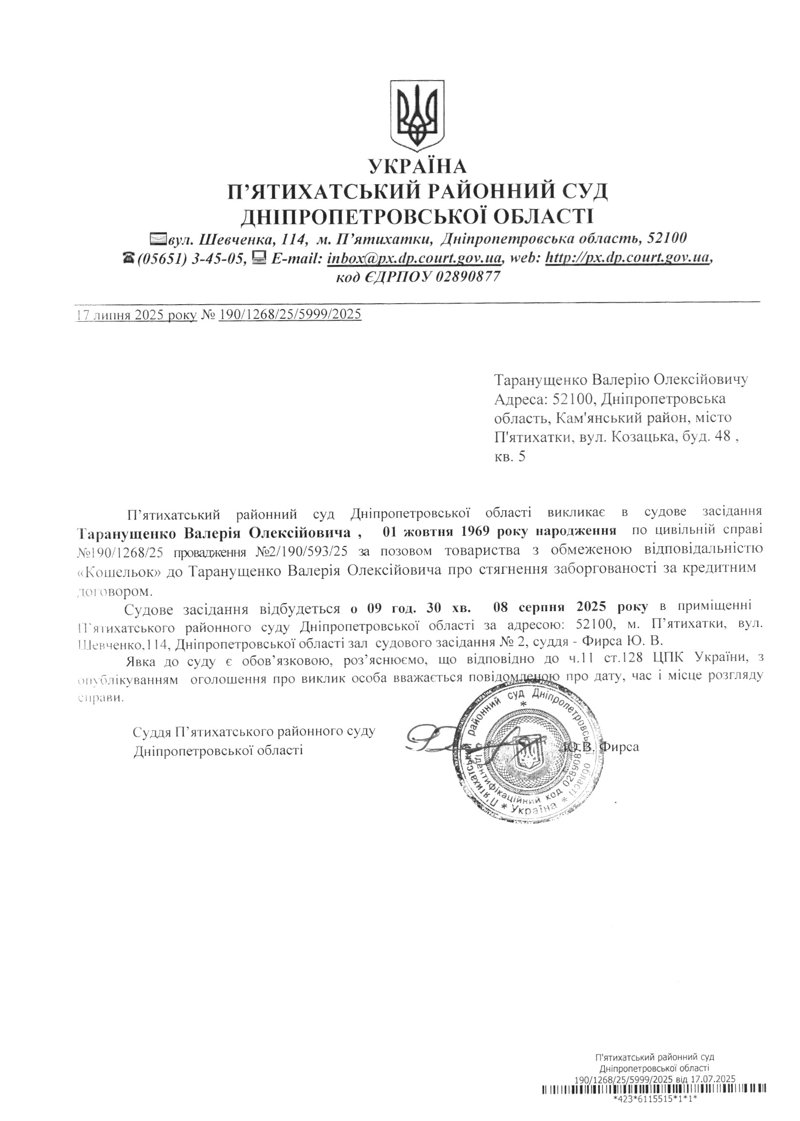 Про виклик в судове засідання Таранущенко Валерій Олексійович