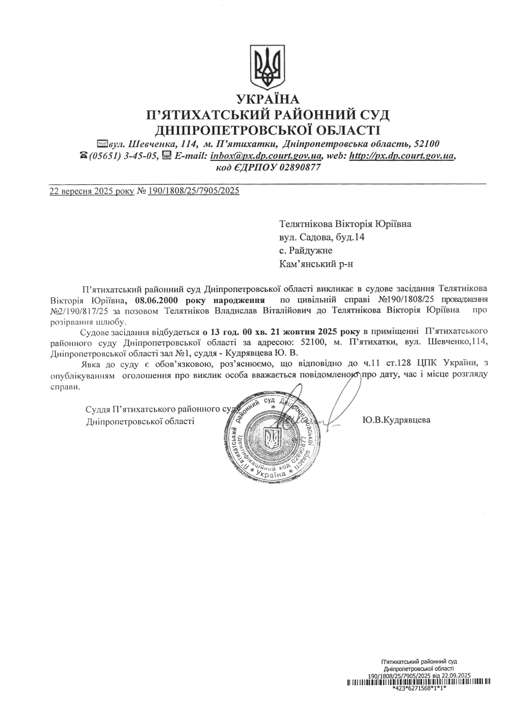 Про виклик в судове засідання Телятнікова Вікторія Юріївна