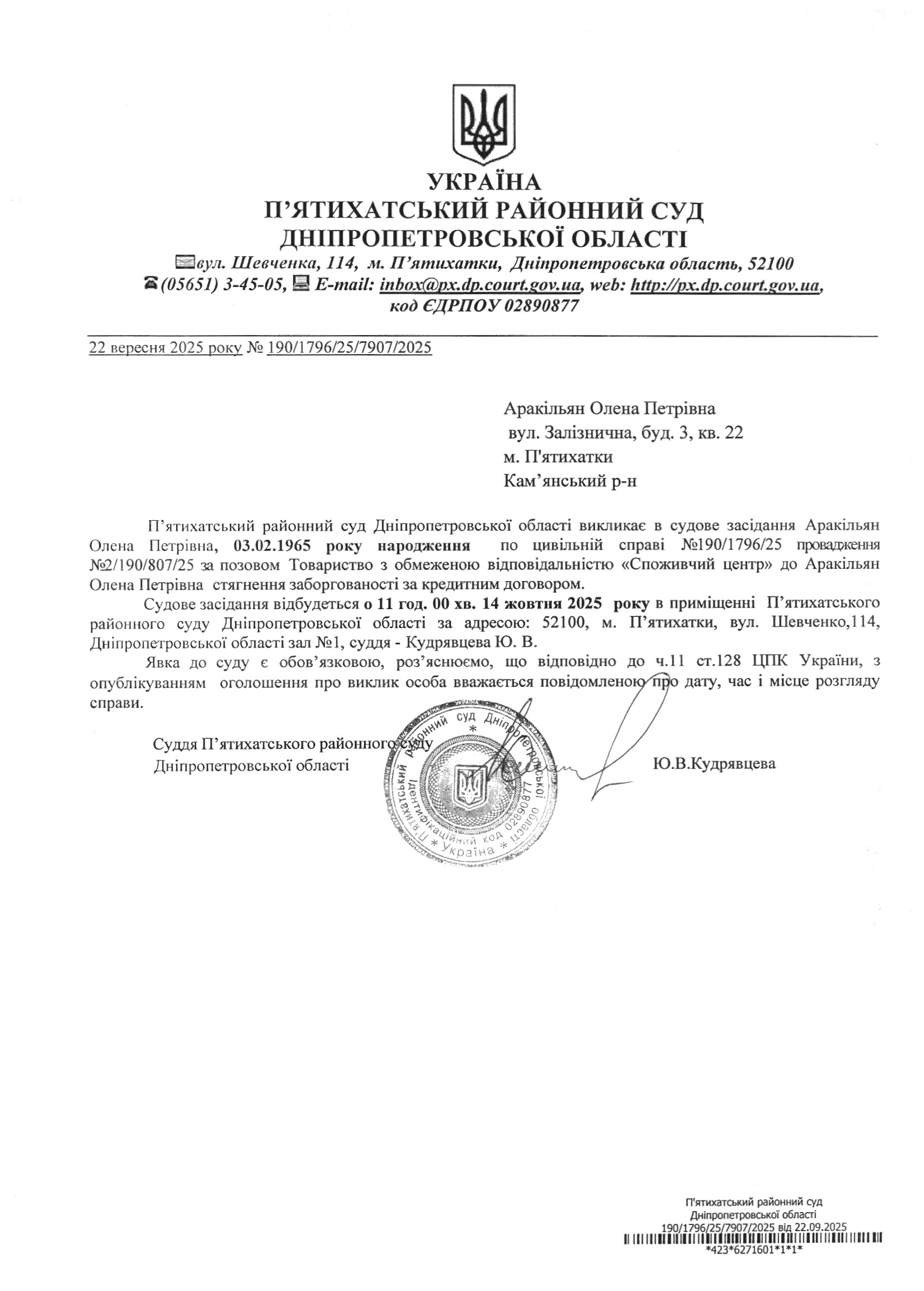 Про виклик в судове засідання Аракільян Олена Петрівна