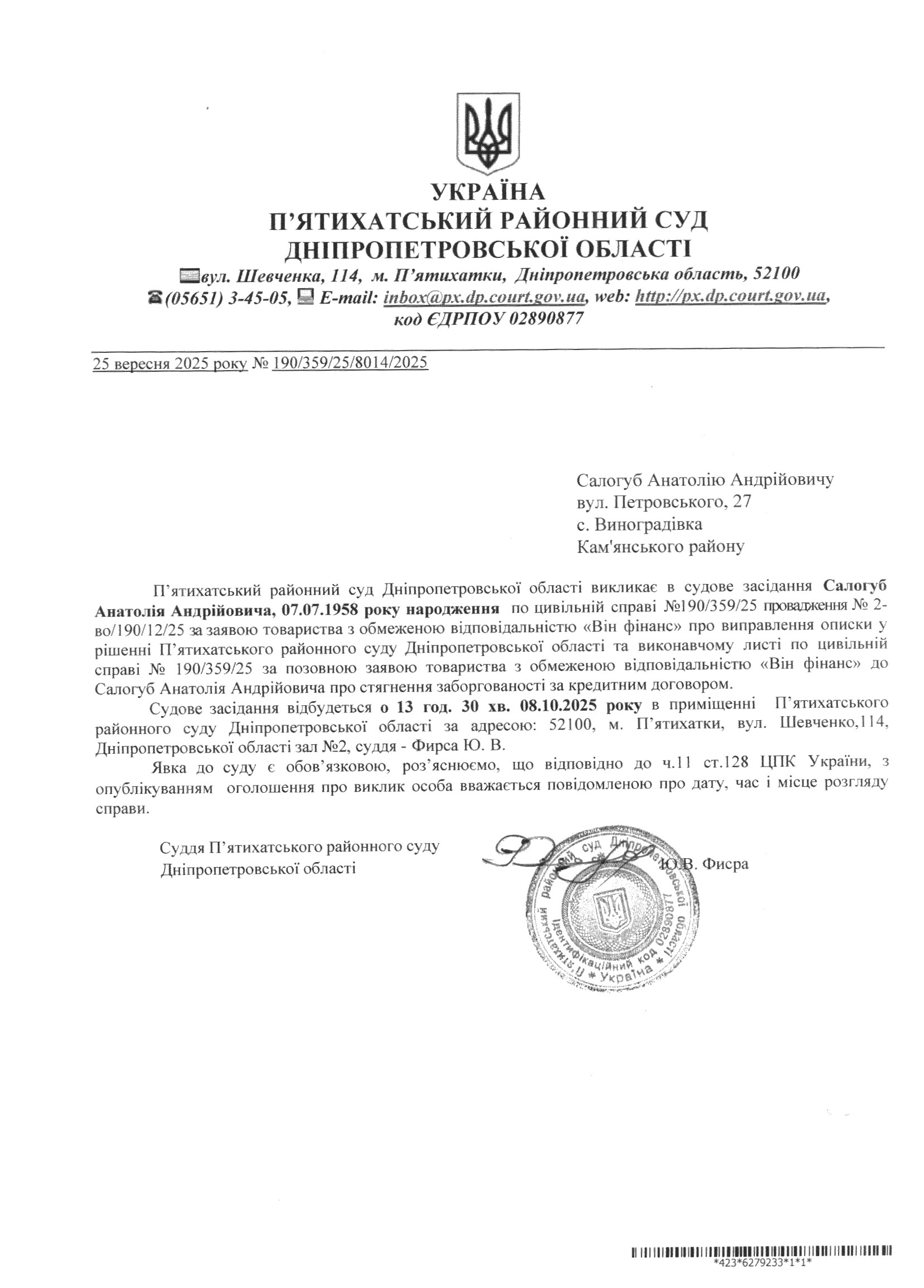 Про виклик в судове засідання Салогуб Анатолій Андрійович