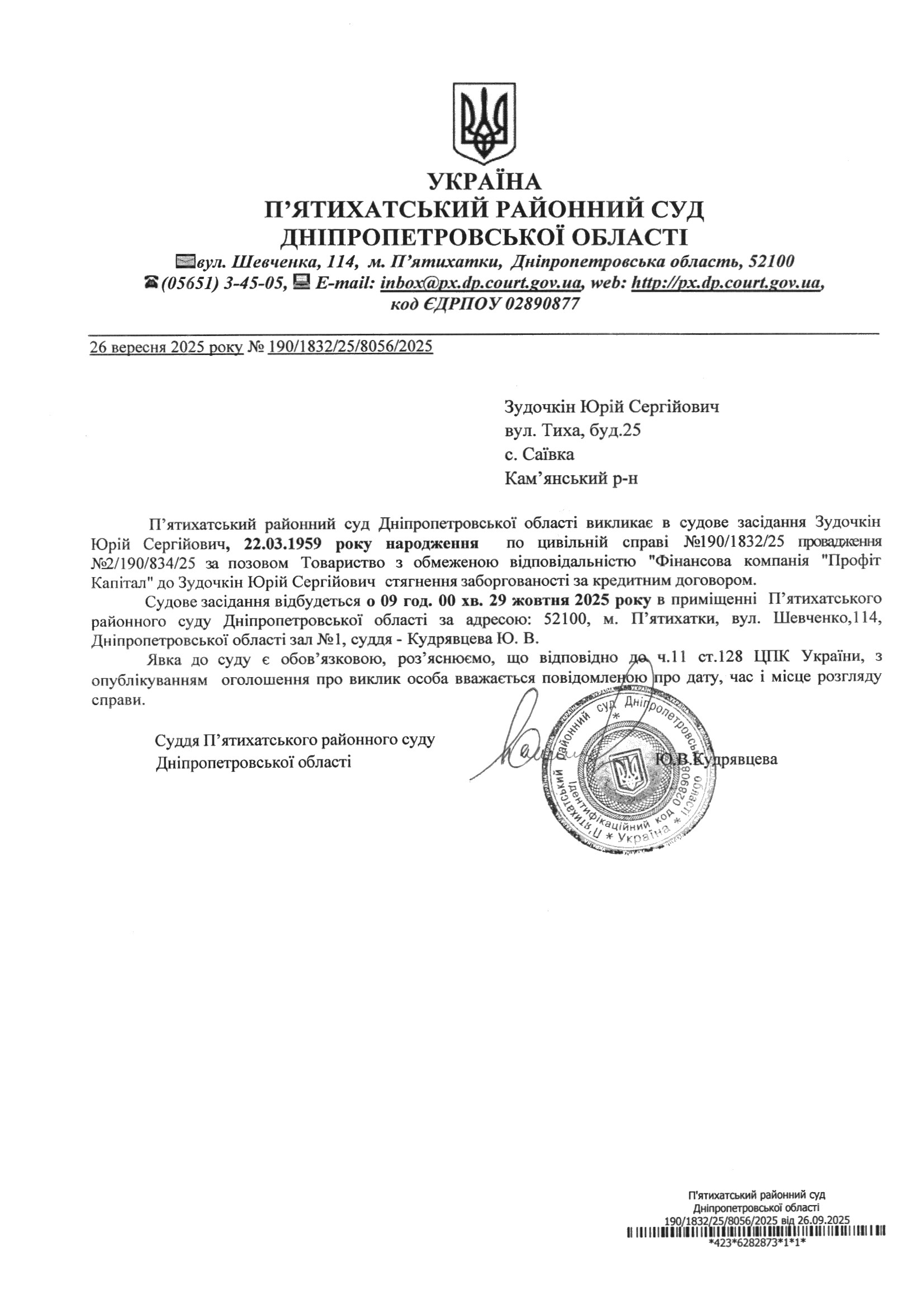 Про виклик в судове засідання Зудочкін Юрій Сергійович