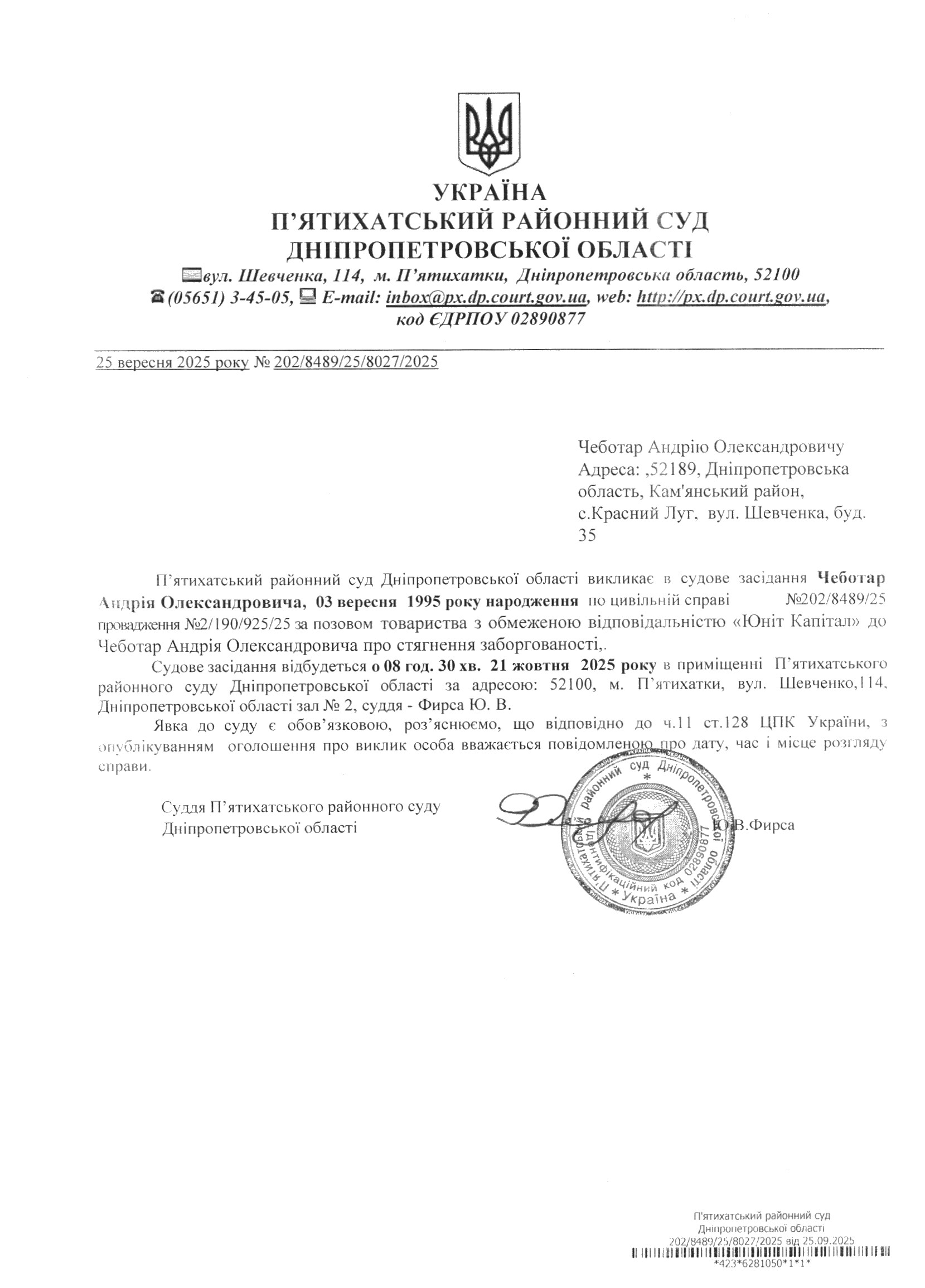 Про виклик в судове засідання Чеботар Андрій Олександрович