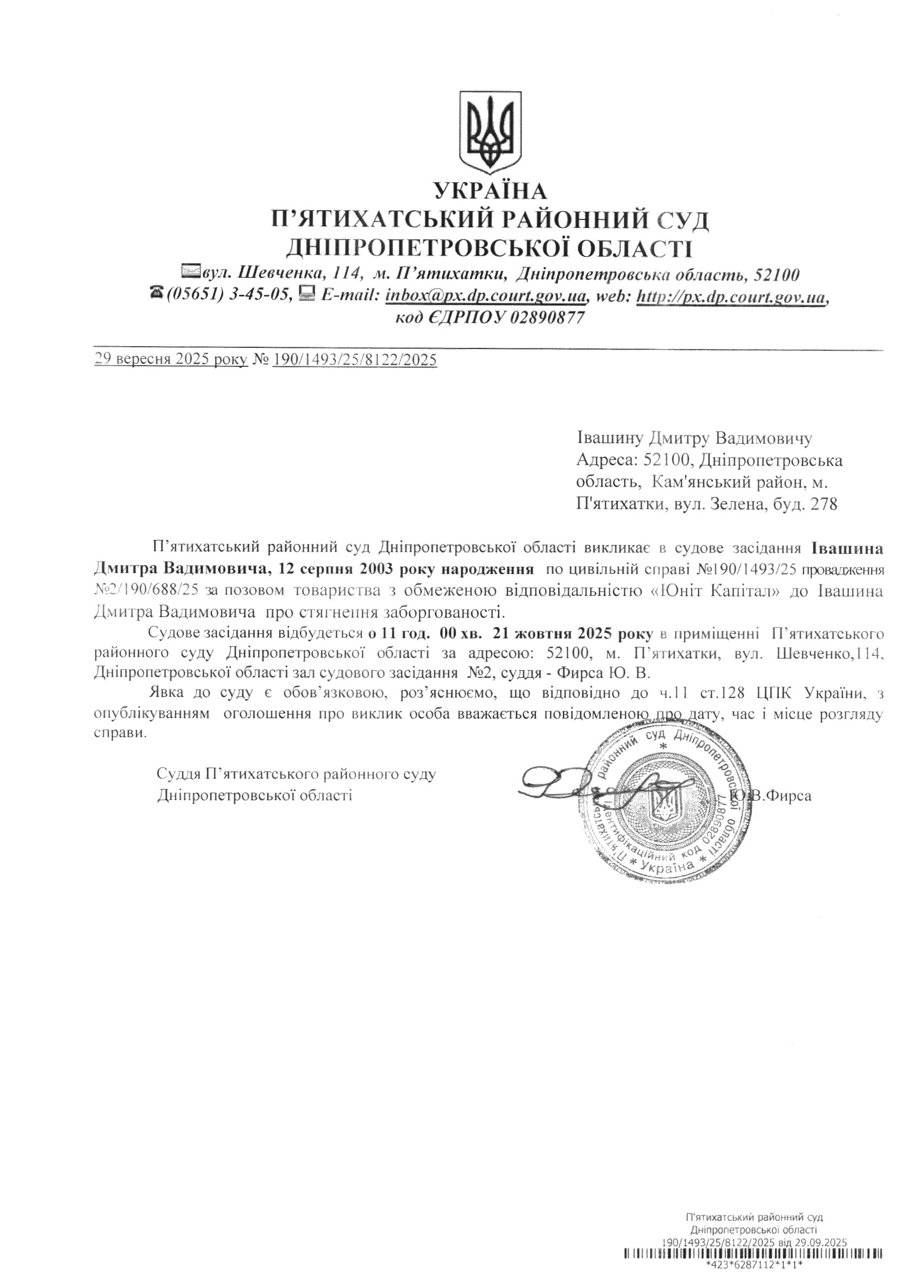 Про виклик в судове засідання Івашина Дмитра Вадимовича