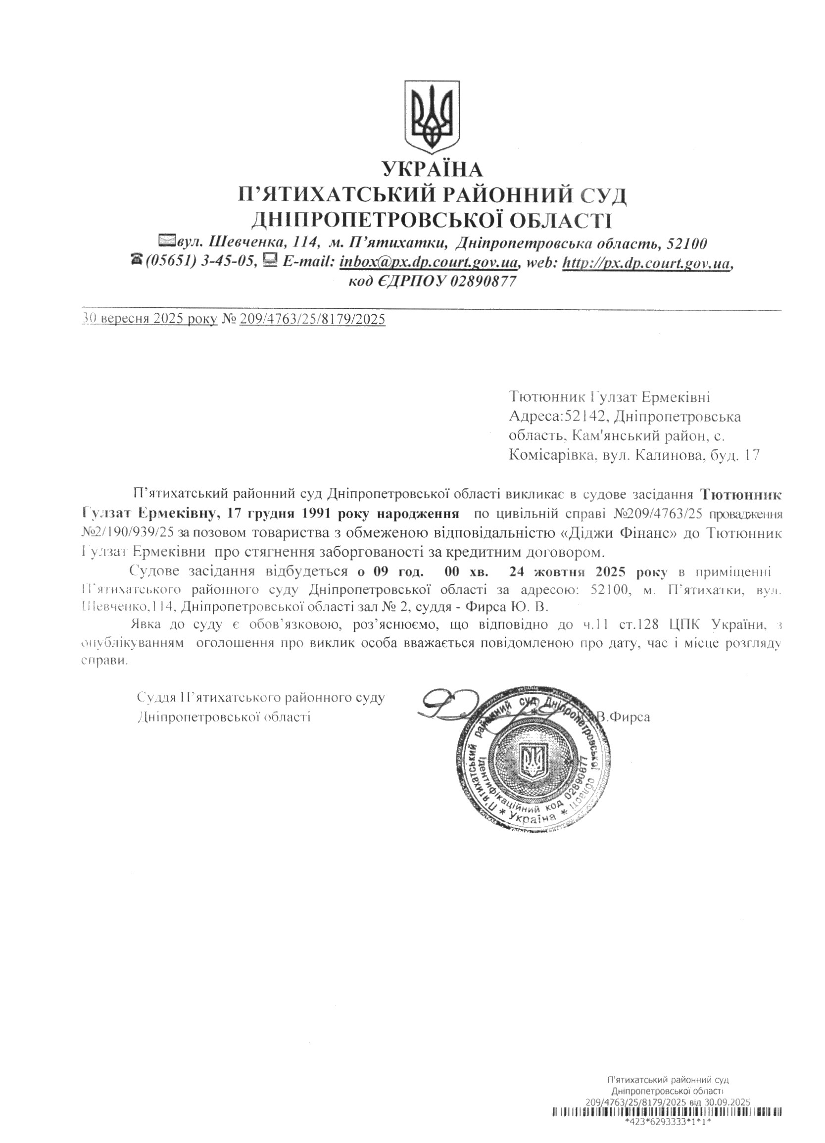 Про виклик в судове засідання Тютюник Гулзат Ермеківна