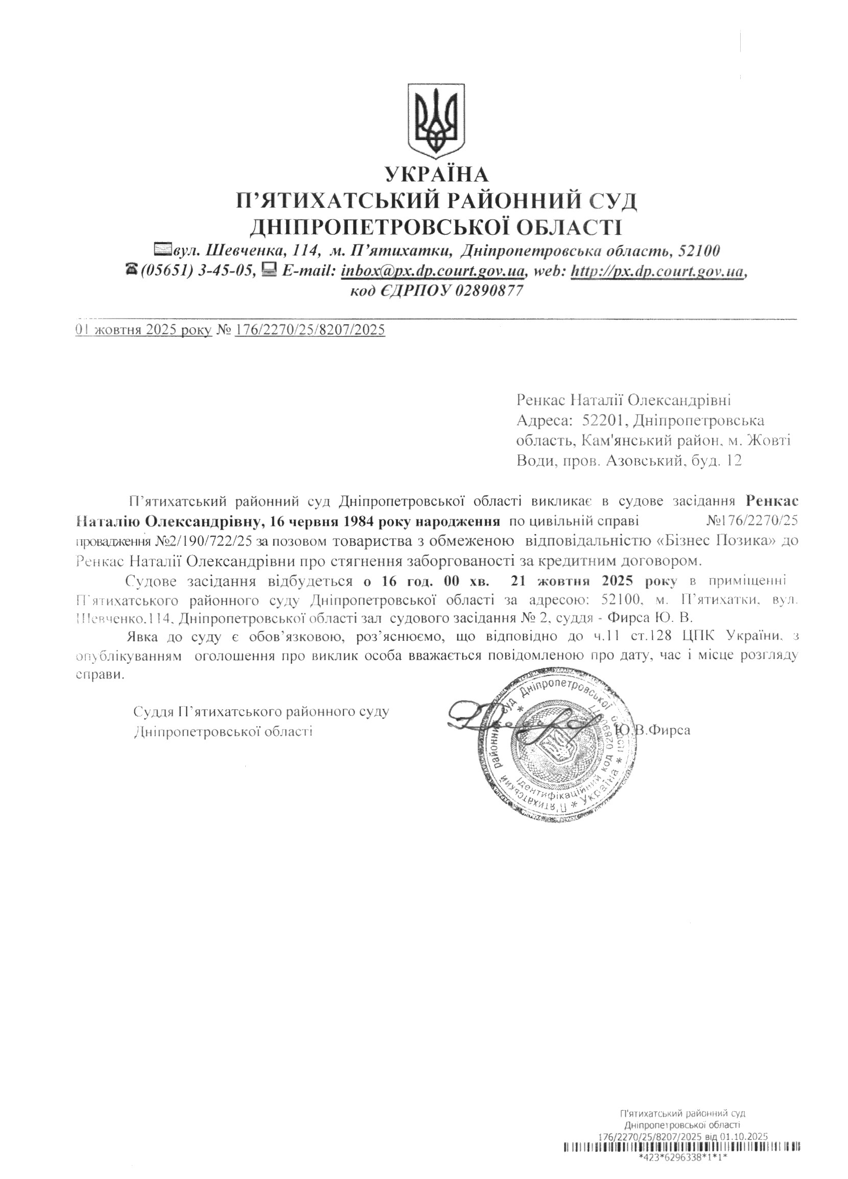 Про виклик в судове засідання Ренкас Наталія Олександрівна
