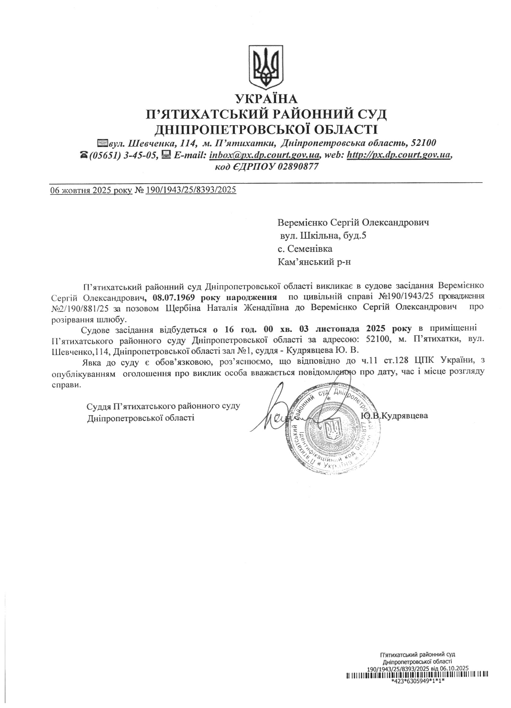 Про виклик в судове засідання Веремієнко Сергій Олександрович