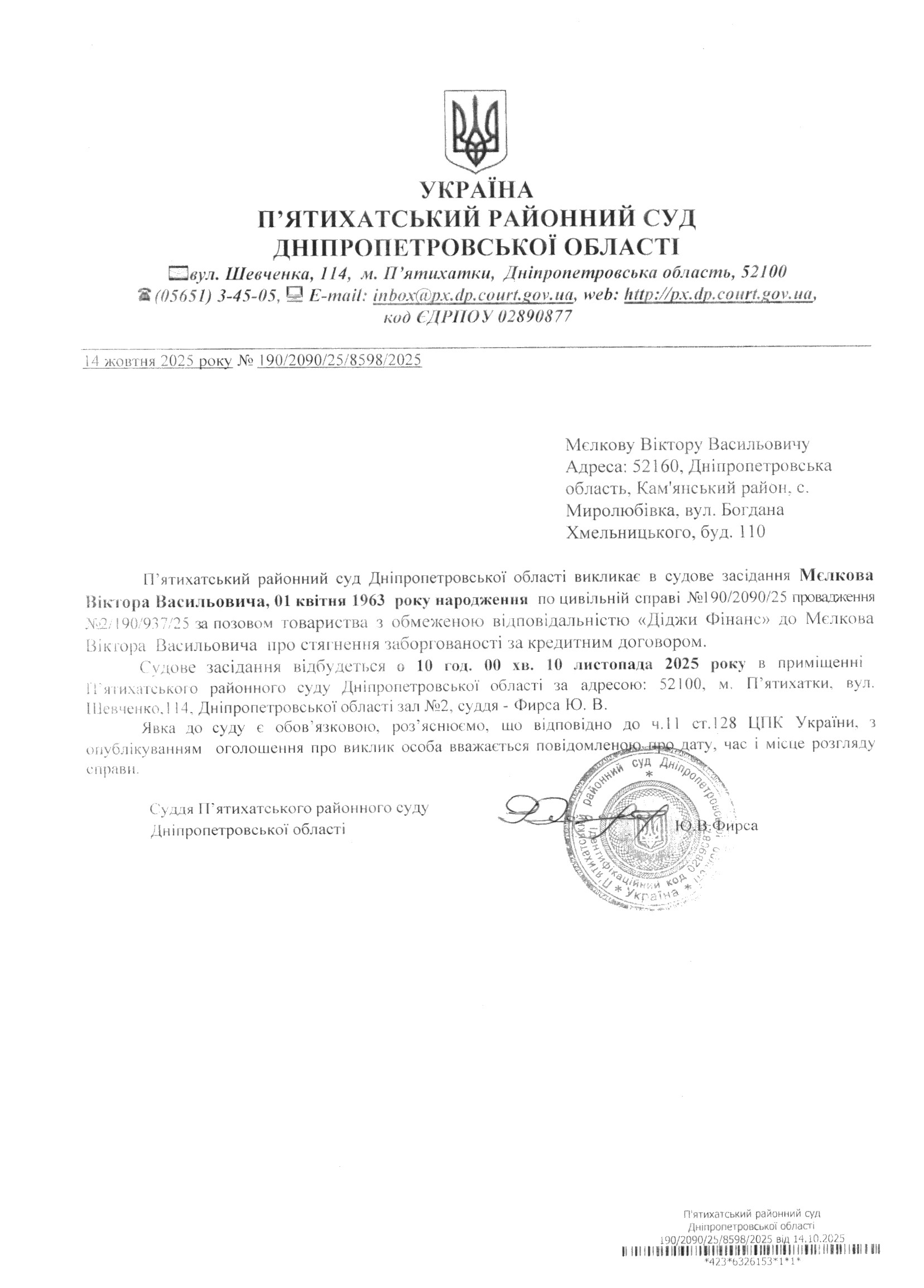 Про виклик в судове засідання Мєлков Віктор Васильович
