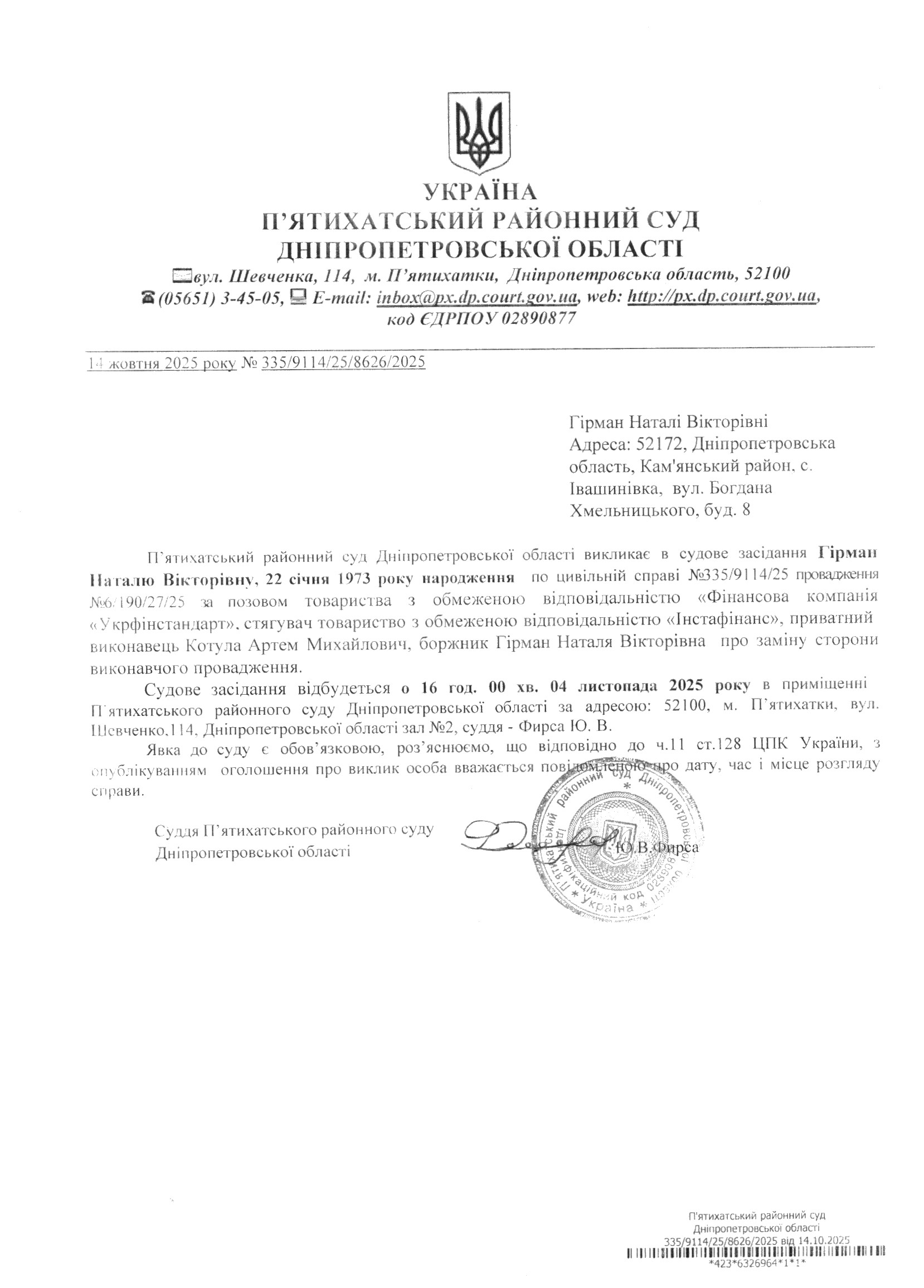 Про виклик в судове засідання Гірман Наталя Вікторівна