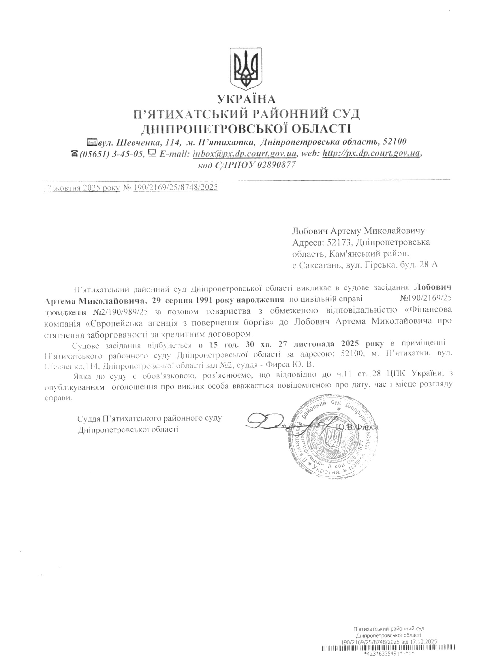 Про виклик в судове засідання Лобовича Артема Миколайовича