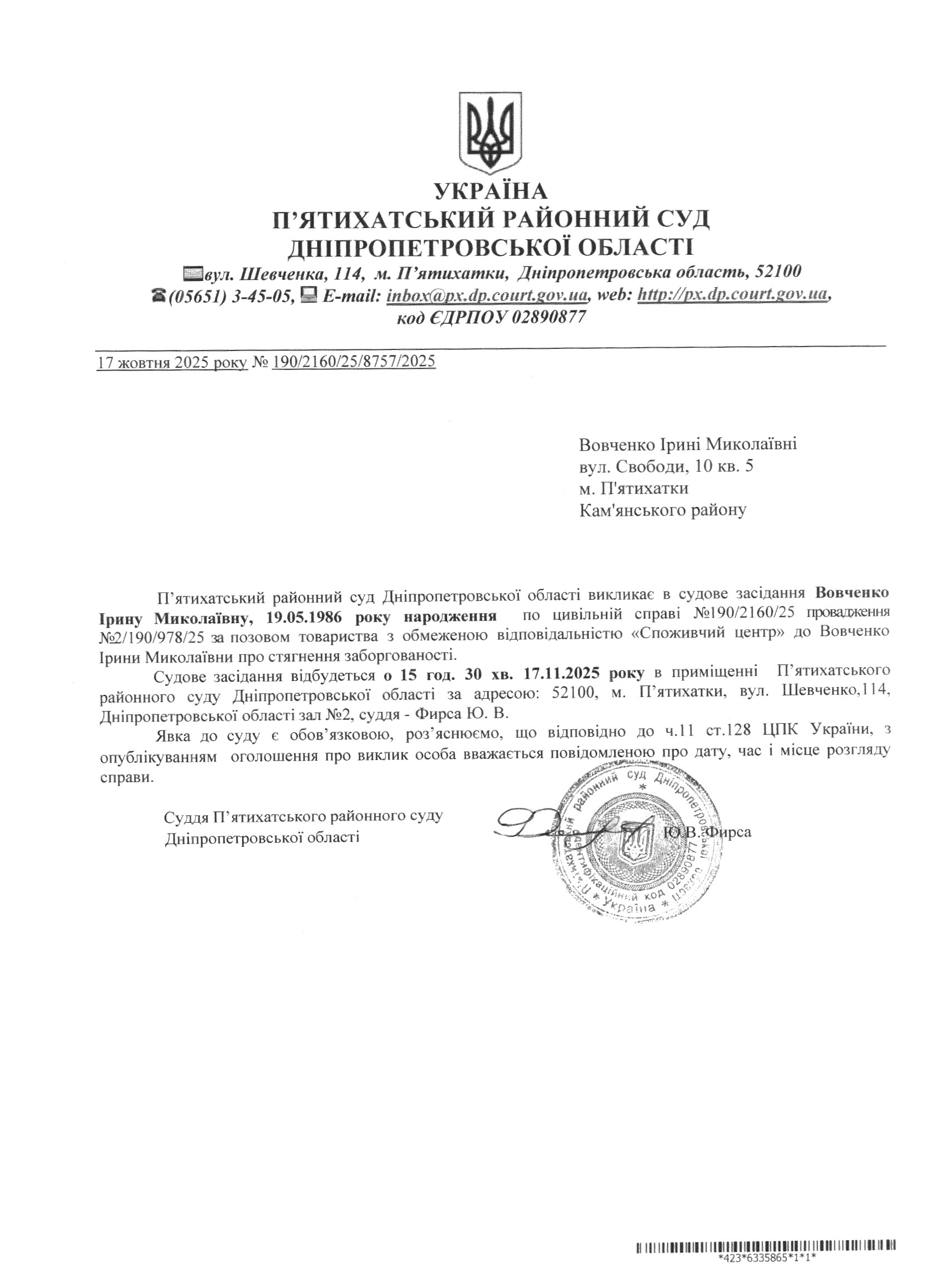 Про виклик в судове засідання Вовченко Ірина Миколаївна