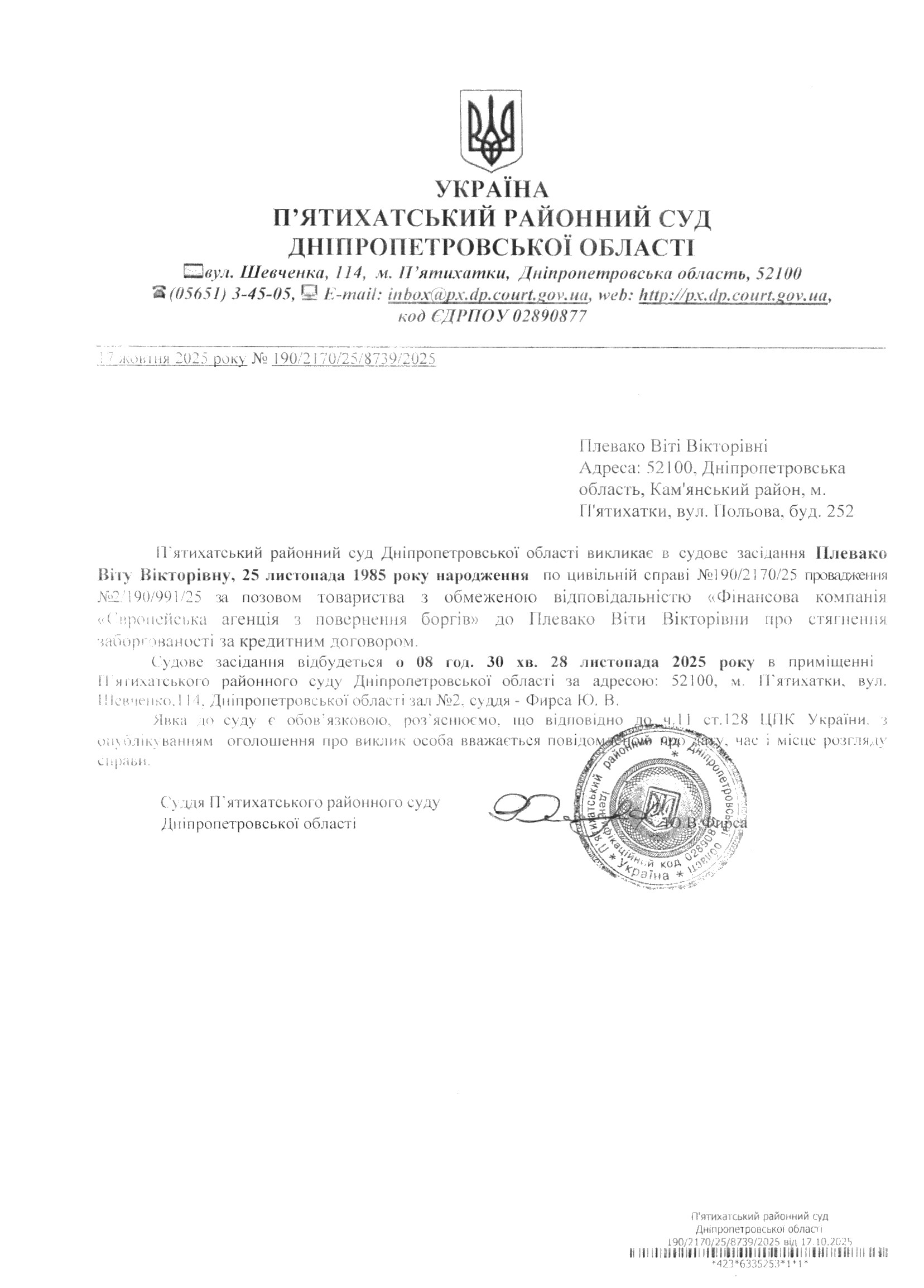 Про виклик в судове засідання Плевако Віта Вікторівна