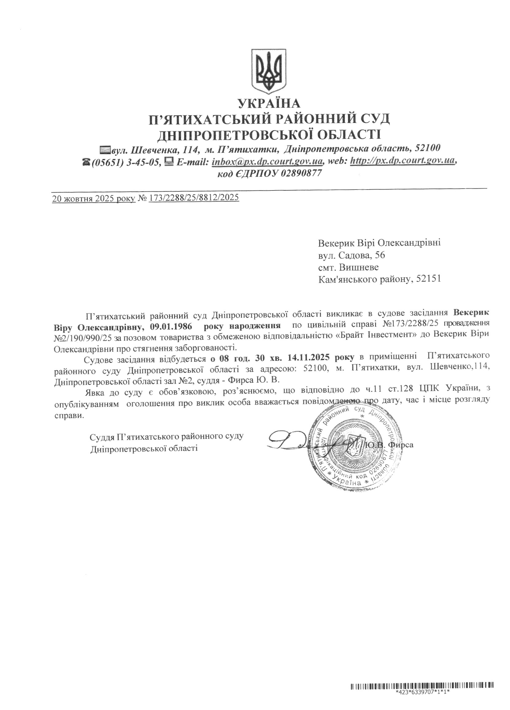 Про виклик в судове засідання Векерик Віра Олександрівна