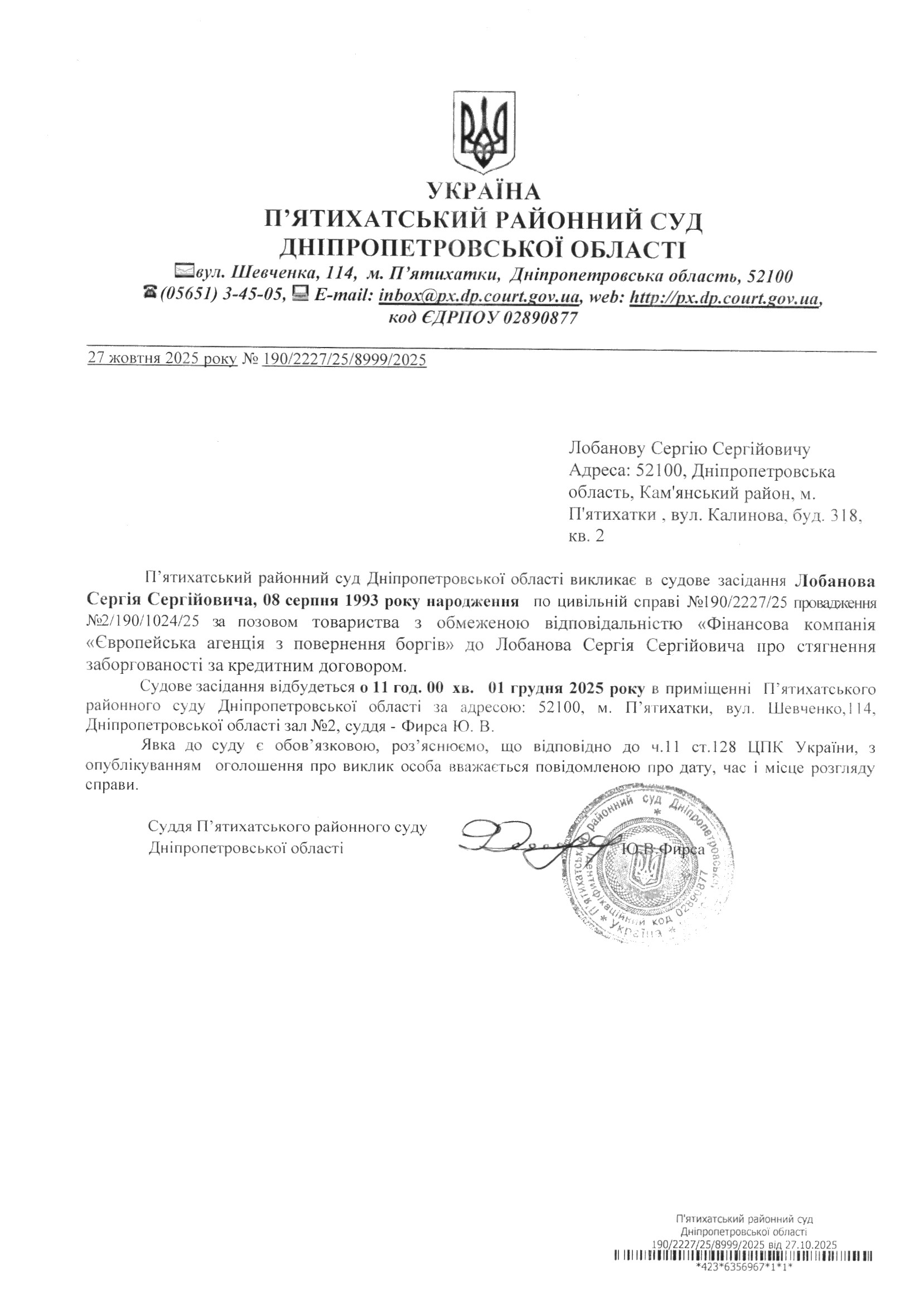 Про виклик в судове засідання Лобанов Сергій Сергійович