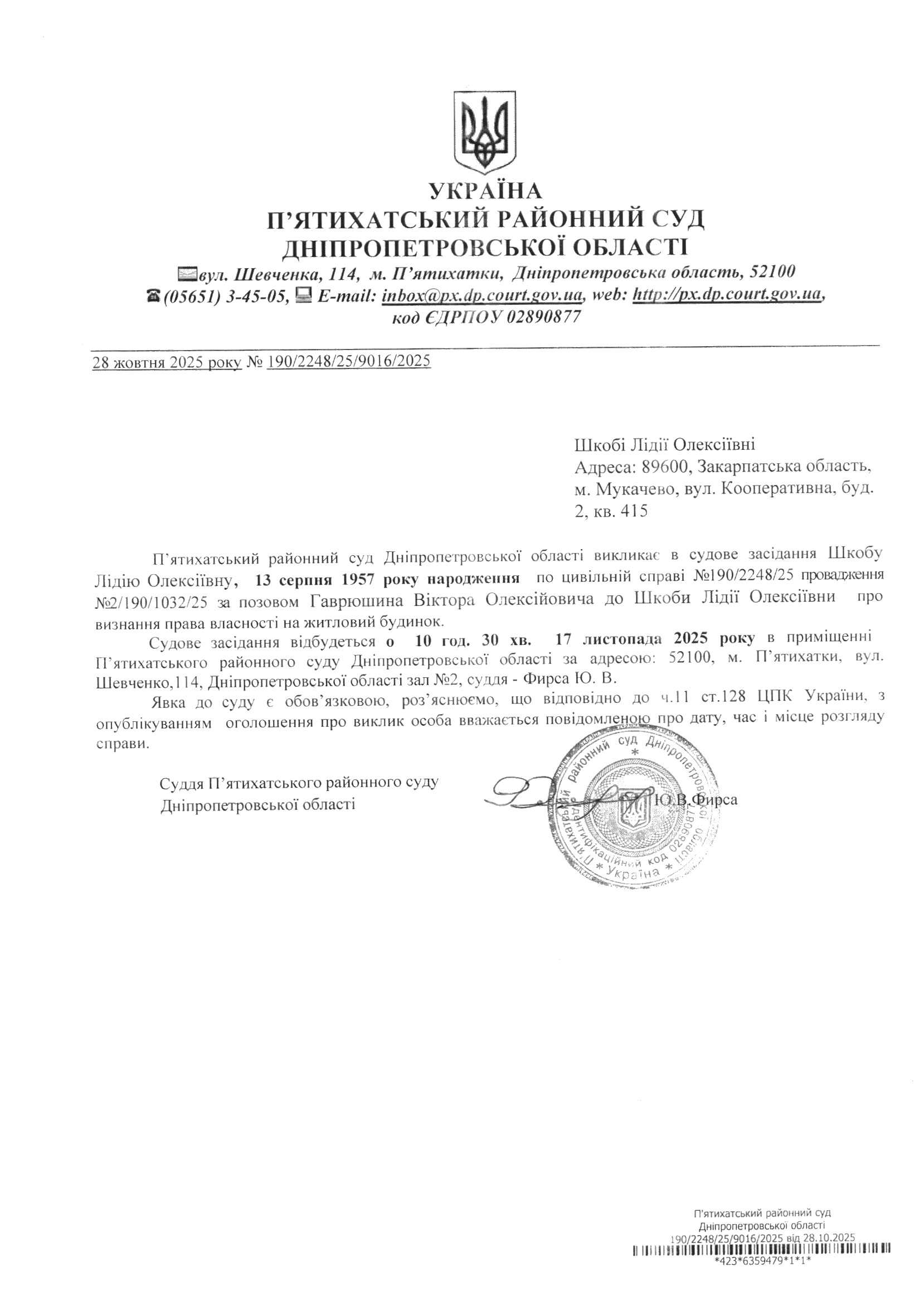 Про виклик в судове засідання Шкоба Лідія Олексіївна