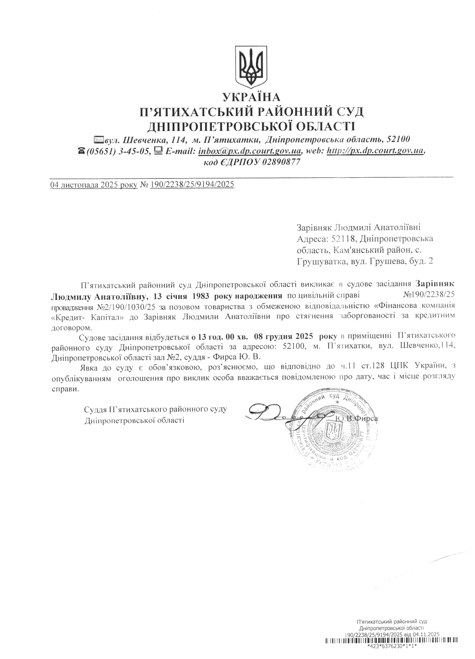 Про виклик в судове засідання Зарівняк Людмила Анатоліївна