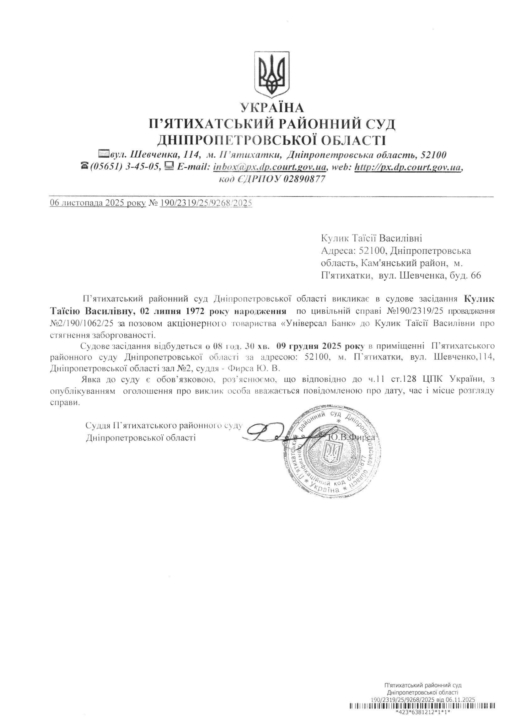 Про виклик в судове засідання Кулик Таїсія Василівна