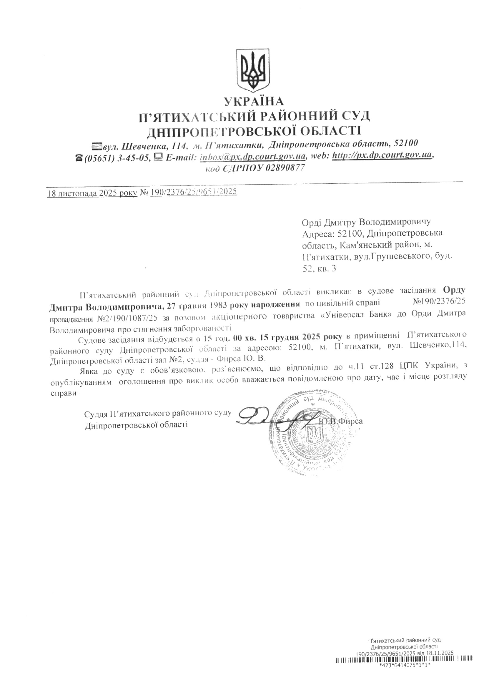 Про виклик в судове засідання Орда Дмитро Володимирович