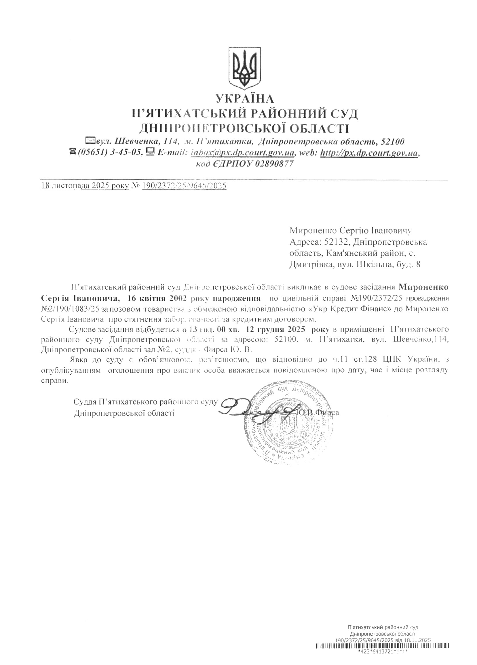 Про виклик в судове засідання Мироненко Сергій Іванович