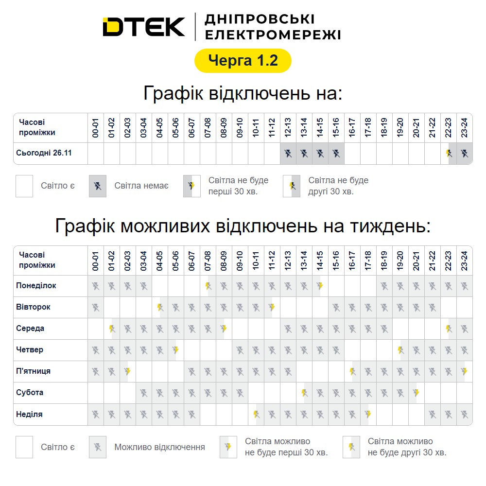 Графік стабілізаційних відключень черга 1.2 на 26.11.2025