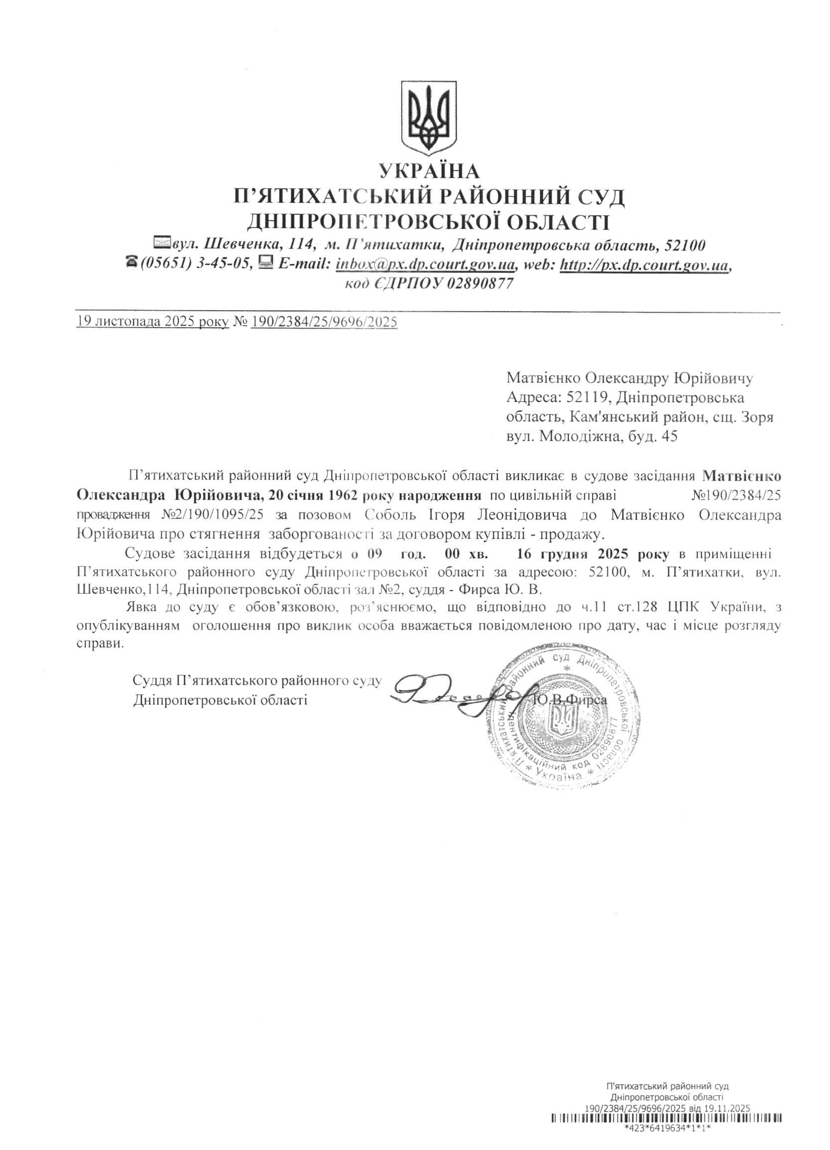 Про виклик в судове засідання Матвієнко Олександр Юрійович