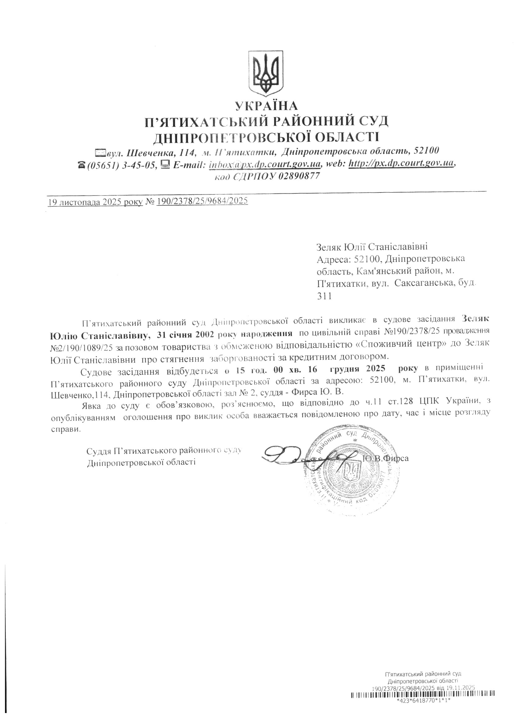 Про виклик в судове засідання Зеляк Юлія Станіславівна