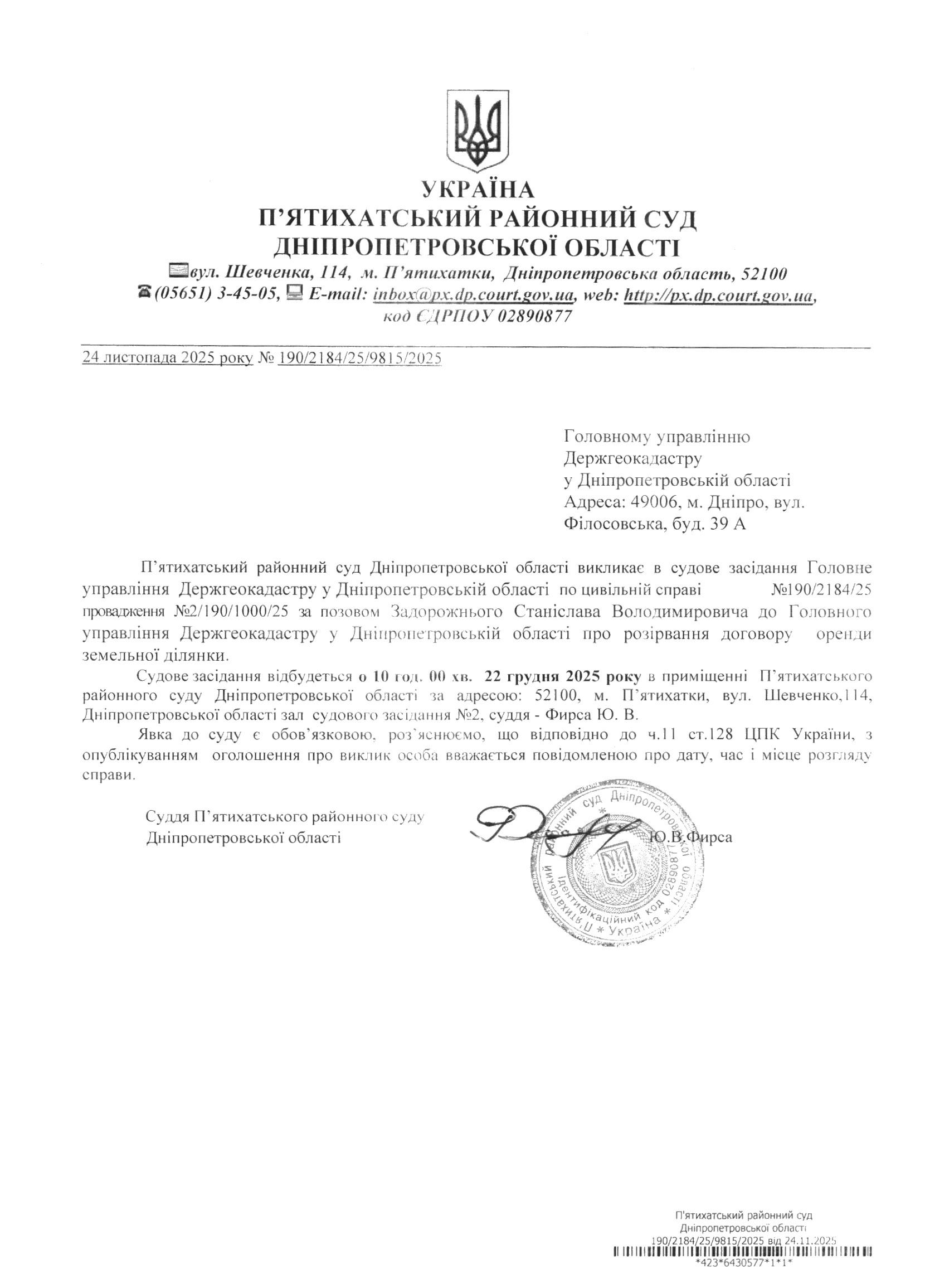 Про виклик в судове засідання ГУ Держгеокадастру у Дніпропетровській області