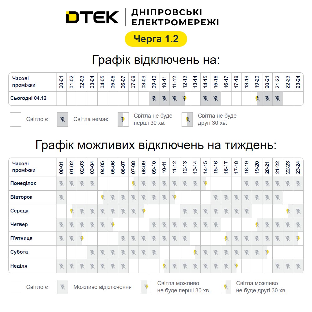 Графік стабілізаційних відключень черга 1.2 на 04.12.2025