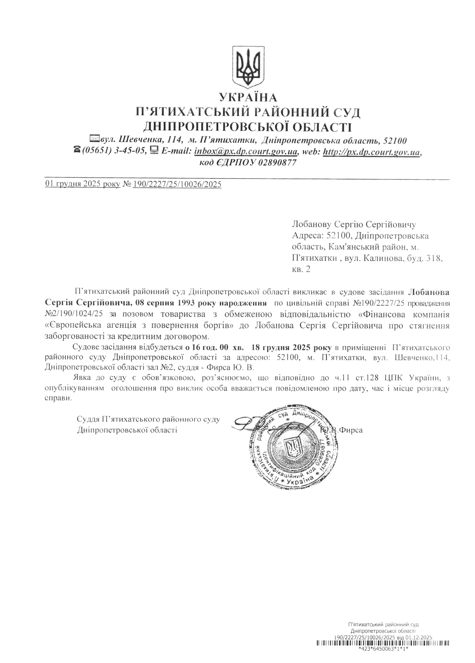 Про виклик в судове засідання Лобанов Сергій Сергійович