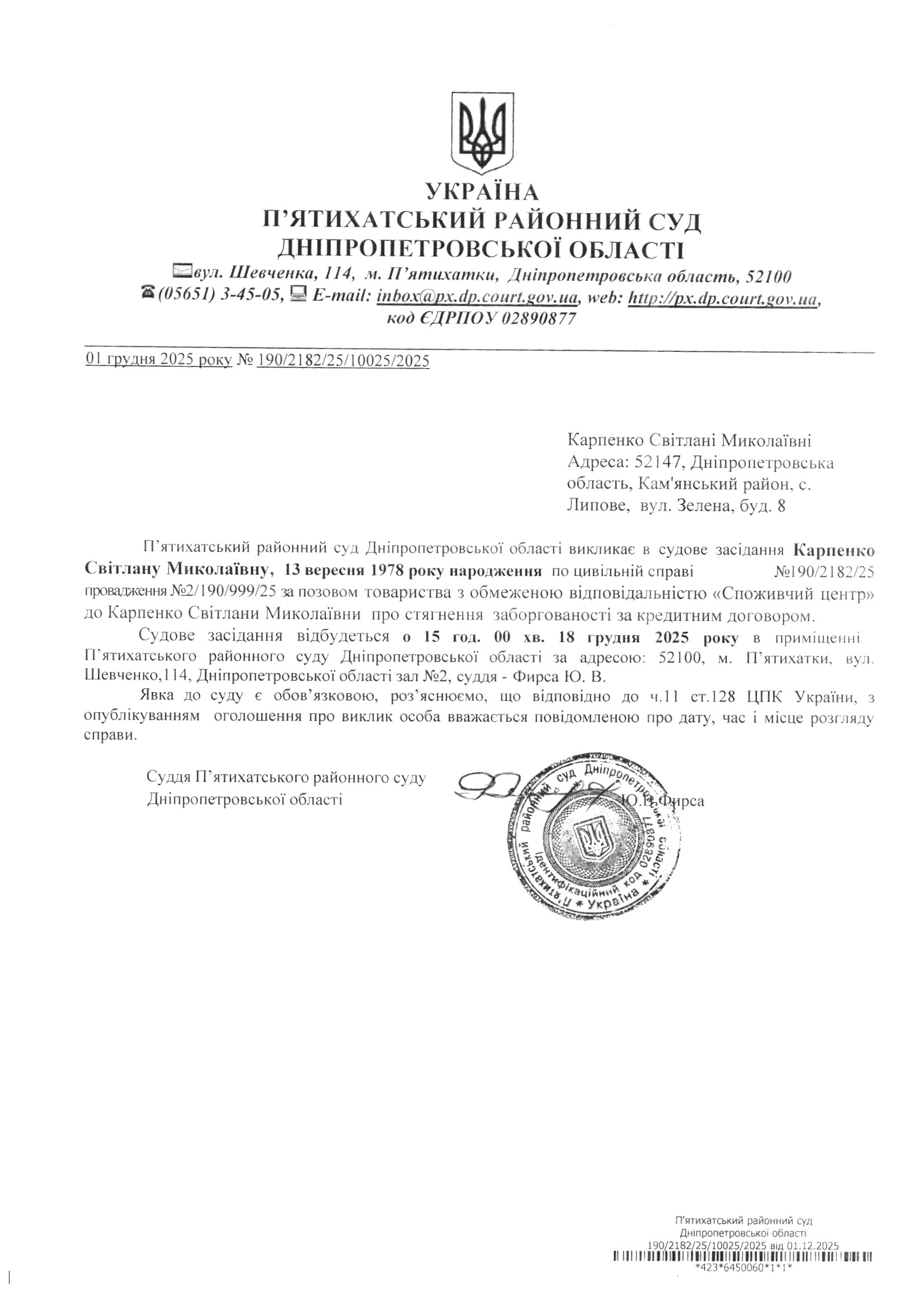 Про виклик в судове засідання Карпенко Світлана Миколаївна