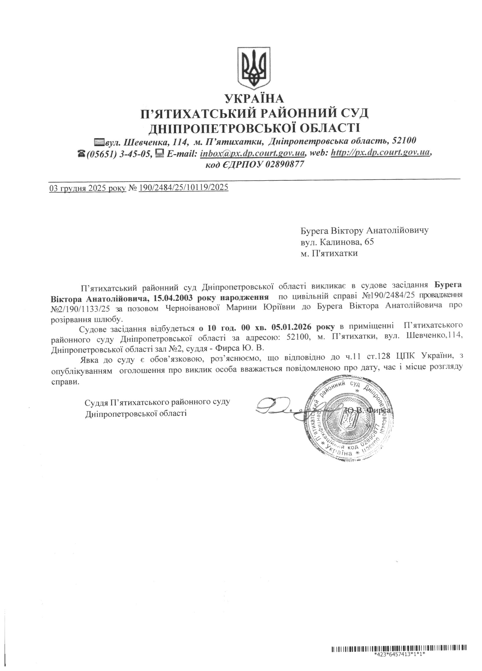 Про виклик в судове засідання Бурега Віктор Анатолійович