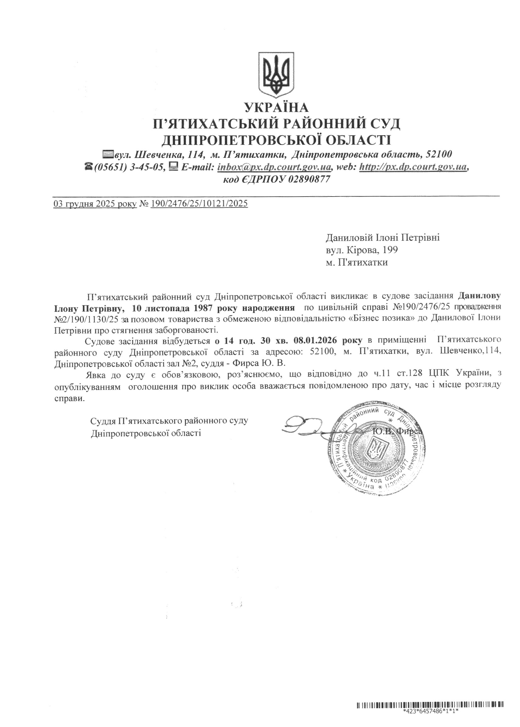 Про виклик в судове засідання Данилова Ілона Петрівна