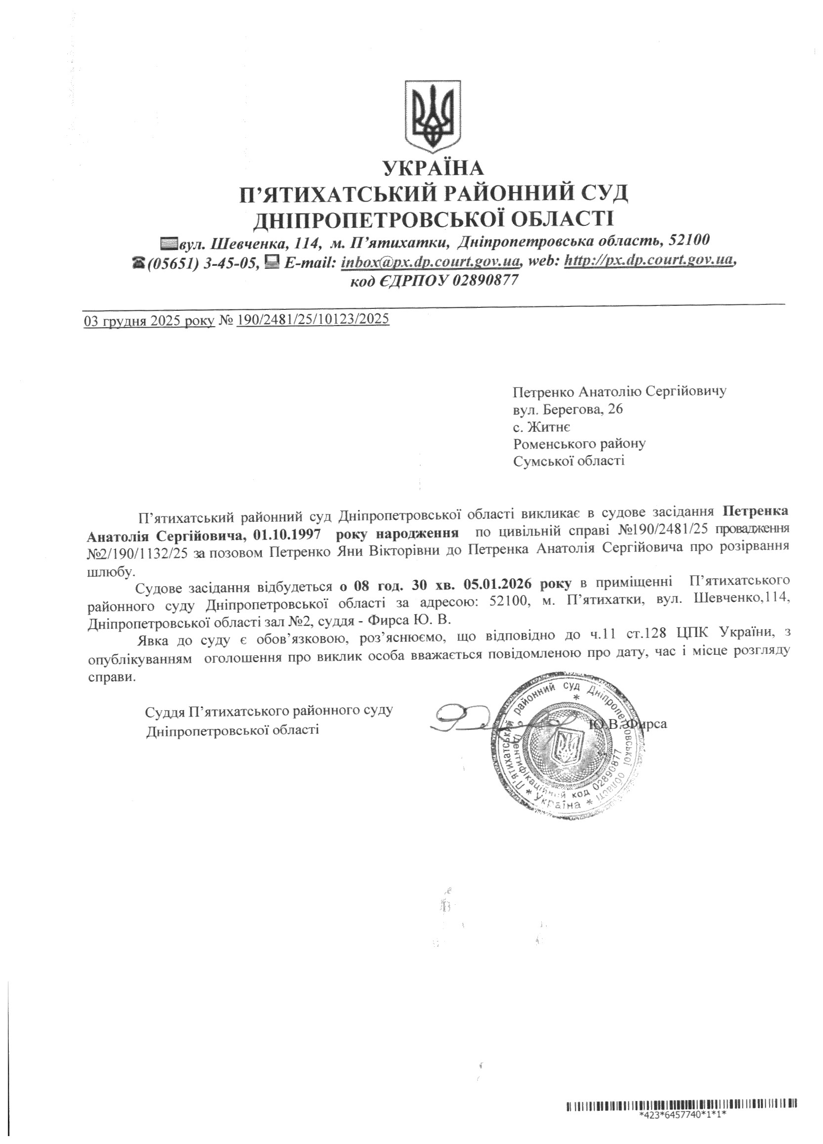Про виклик в судове засідання Петренко Анатолій Сергійович