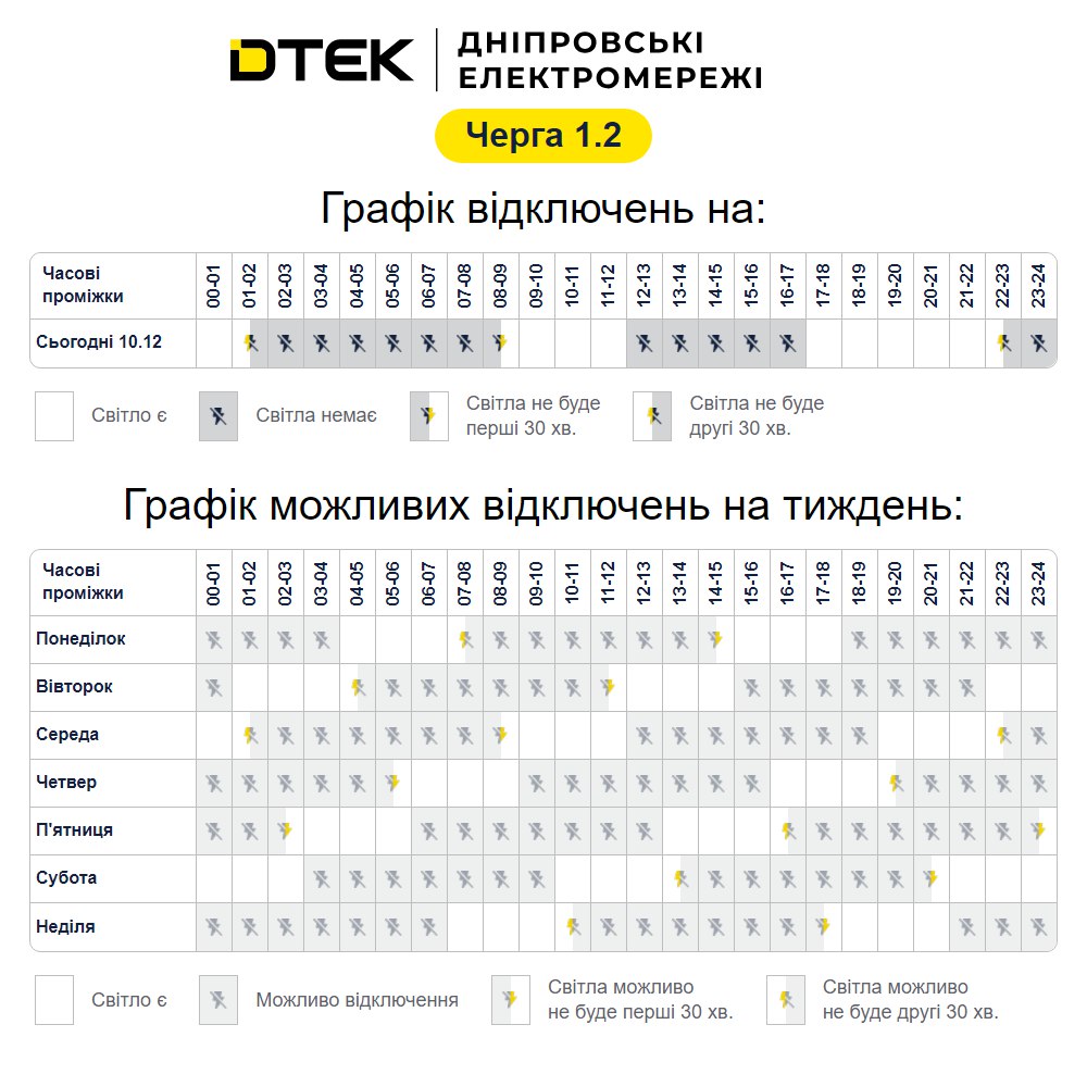 Графік стабілізаційних відключень черга 1.2 на 10.12.2025