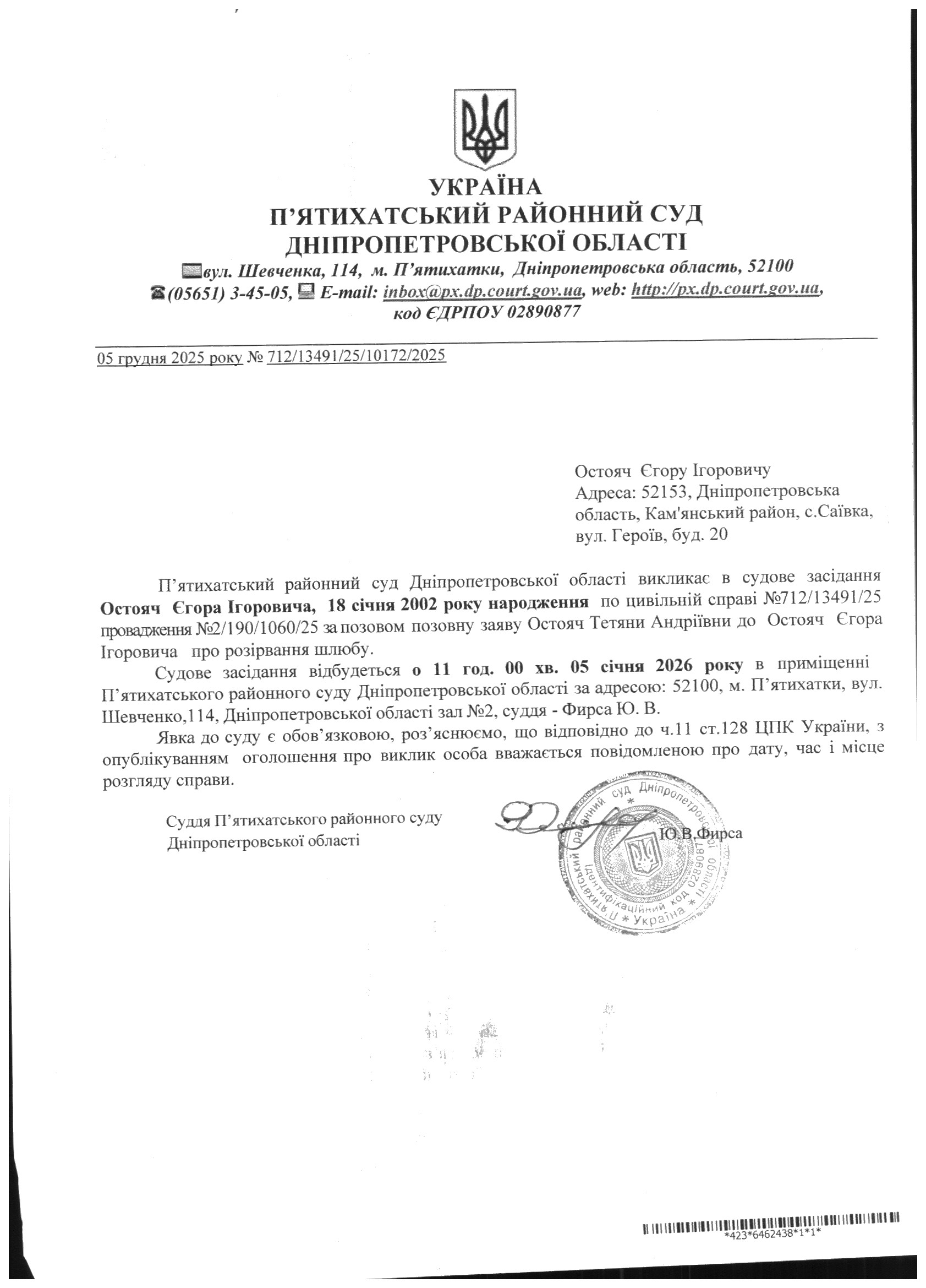 Про виклик в судове засідання Остояч Єгор Ігорович