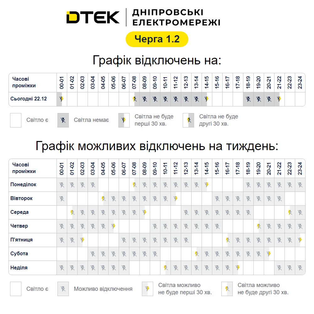 Графік стабілізаційних відключень черга 1.2 на 22.12.2025