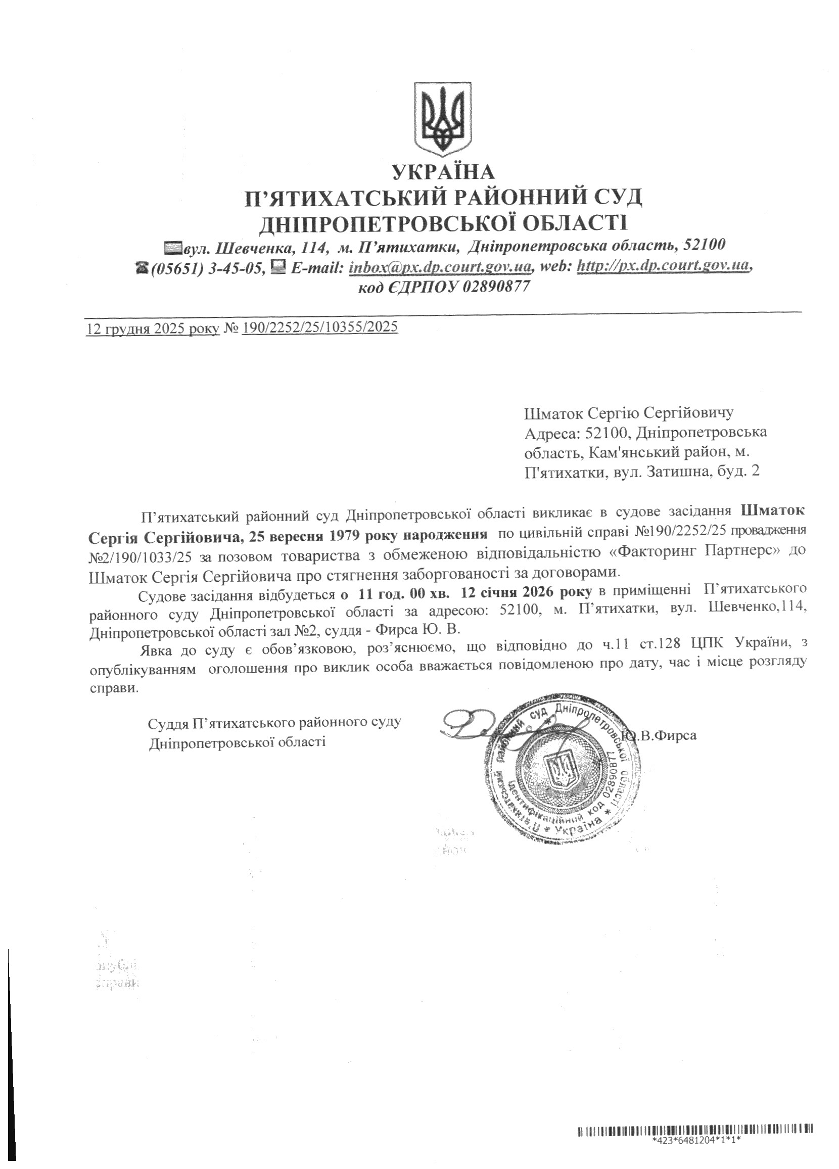 Про виклик в судове засідання Шматок Сергій Сергійович
