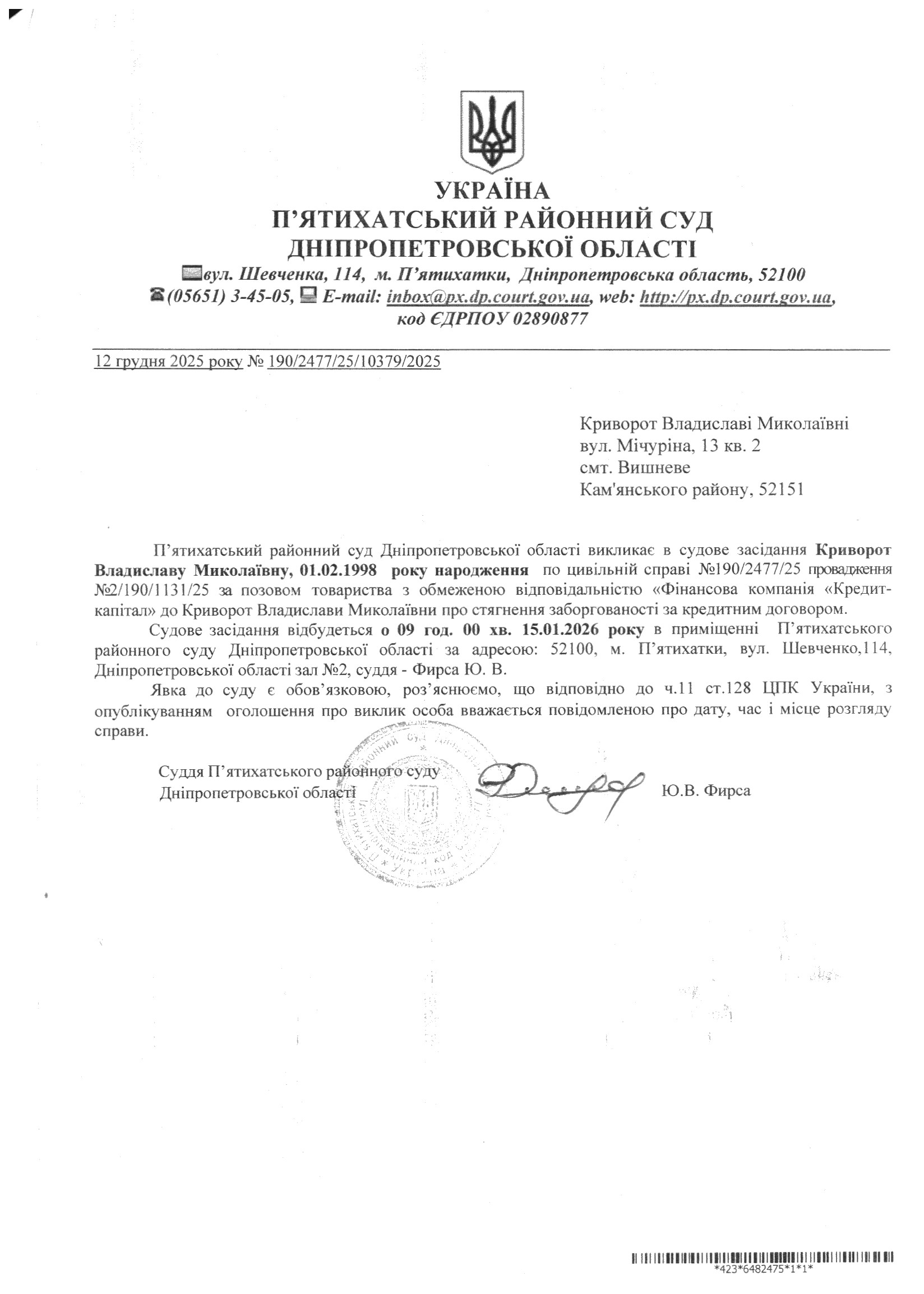 Про виклик в судове засідання Криворот Владислава Миколаївна